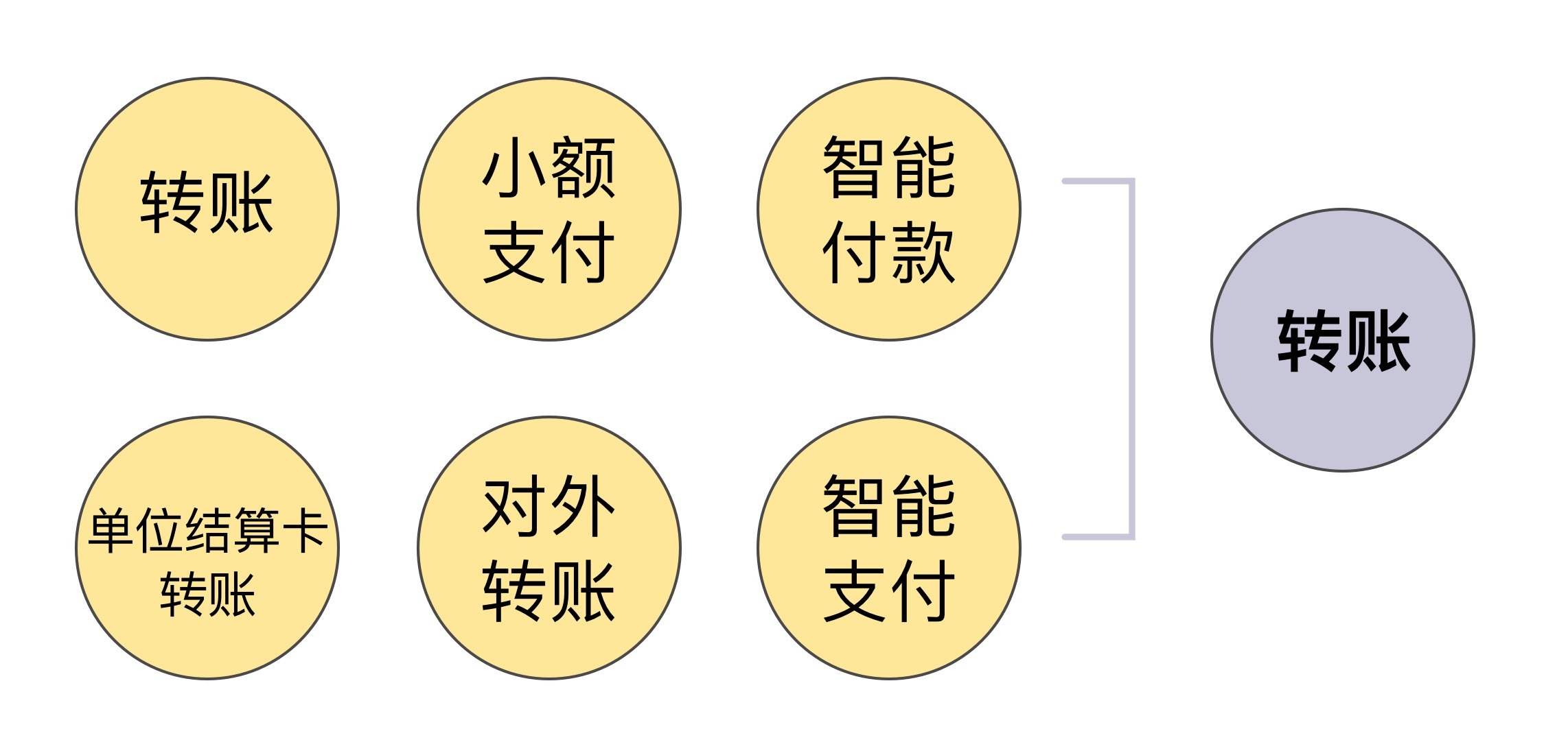 比如说,有“转账、智能支付、对外转账、扫码转账、小额支付、企业内部转账、单位结算卡转账、智能支付”。看到这些名字,是不是已经蒙圈了?根本没有心情分清这些名词都是啥。