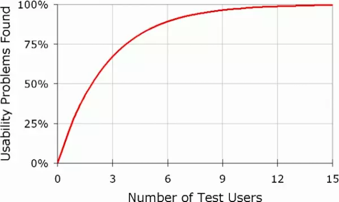 在这里,不得不先说一下Nielsen提出的一个法则:有5人参加的用户可用性测试,即可发现85%的产品可用性问题,而且通常最严重的问题都是前几名用户发现的,随着用户数量的增多,发现的问题逐渐减少,被发现问题的数量与测试用户数量的关系如下图所示。
