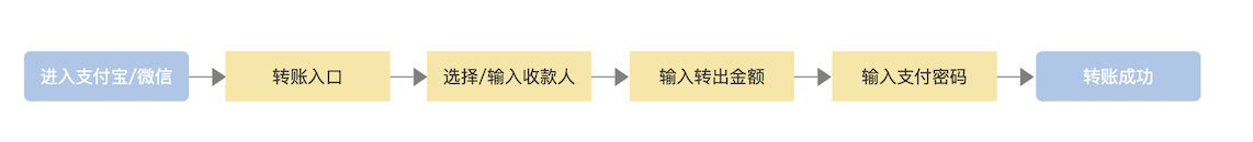 以“转账”为例,从字面理解,转账不就是把钱从用户A手里转移到用户B手里吗?比如说,我们很熟悉的支付宝或者微信转账,把流程稍微拆分一下,分别是: