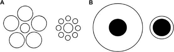 如下的A中有左右两个图形,两个图形正中心都有一个白色的圆。哪个白色的圆大一些?B中也有左右两个图形,两个图形的正中心都有一个黑色的圆。哪个黑色的圆更大一些?大部分人都会觉得,不管是A还是B,右边中心的圆总是比左边中心的圆要大一点点。