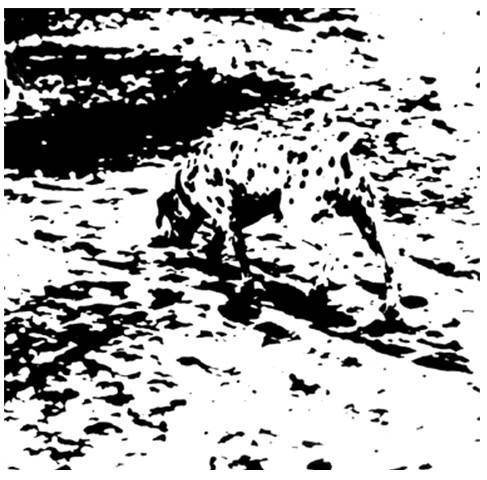 你可以看看下面这个图片。这张图片仿佛白纸上弄脏了,搞得都是随机的墨汁黑色污渍。但真是这样吗?你稍微仔细看一下就会发现,这是一只斑点狗在树荫下的地面上嗅着什么。