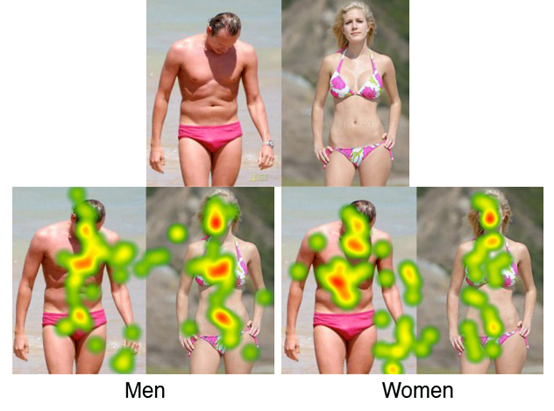 以前我们人因研究小组经常做眼动仪实验(人的视觉焦点选择真的很好玩)。比如对于泳装帅哥和泳装美女来说,男生和女生的视觉焦点分别看过去,焦点选择差别还挺大的。如果动态来跟踪人的视觉焦点动线,你就知道人的视线都在什么事物上反复停留。