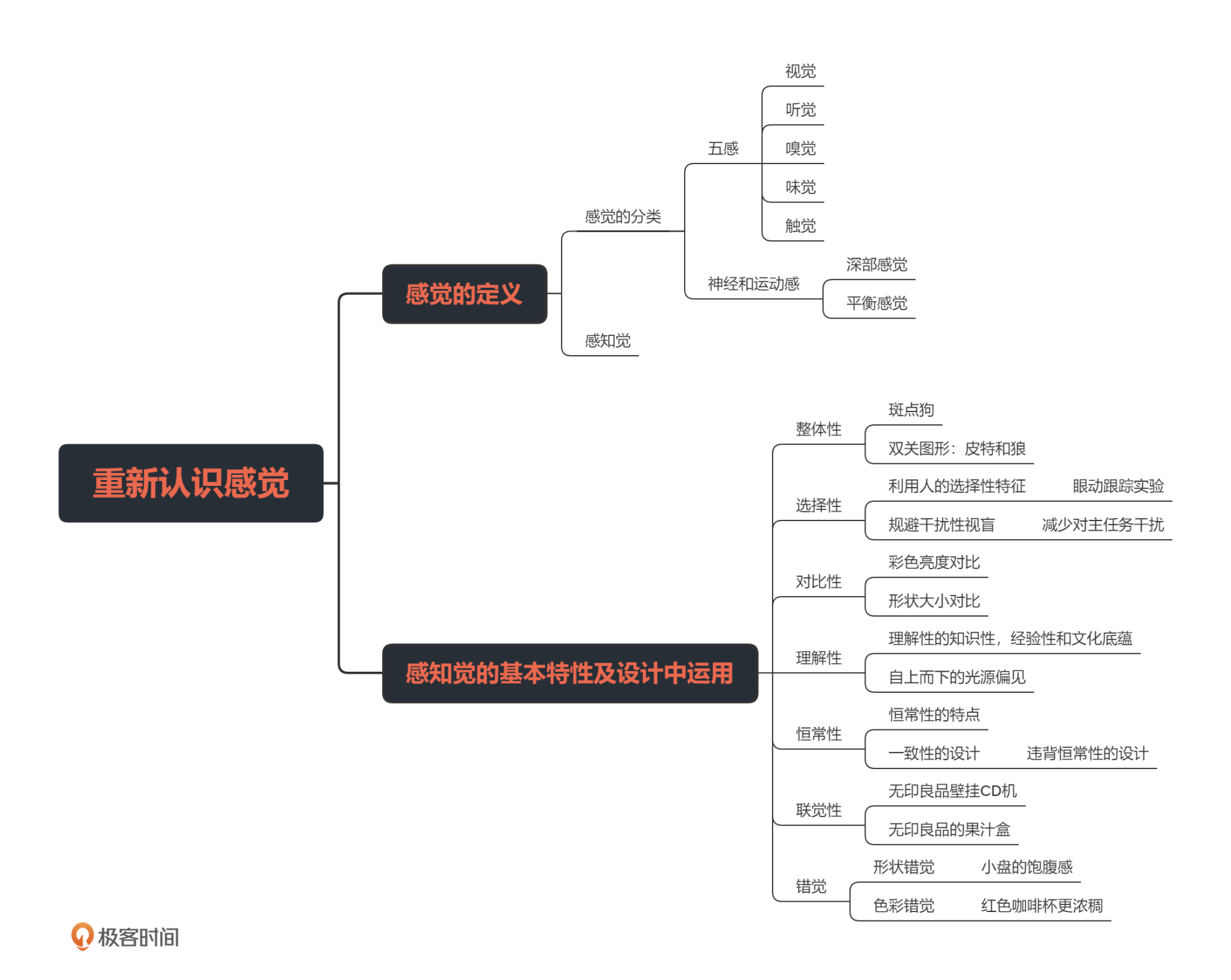 其实很多好的设计不仅仅考虑到了一种感知觉特性。你在日常的设计中要根据业务需求灵活运用,不必僵化。最后我还给你总结了一个脑图,可以长按保存下来,它对在设计中如何重新认识感觉会很有帮助。