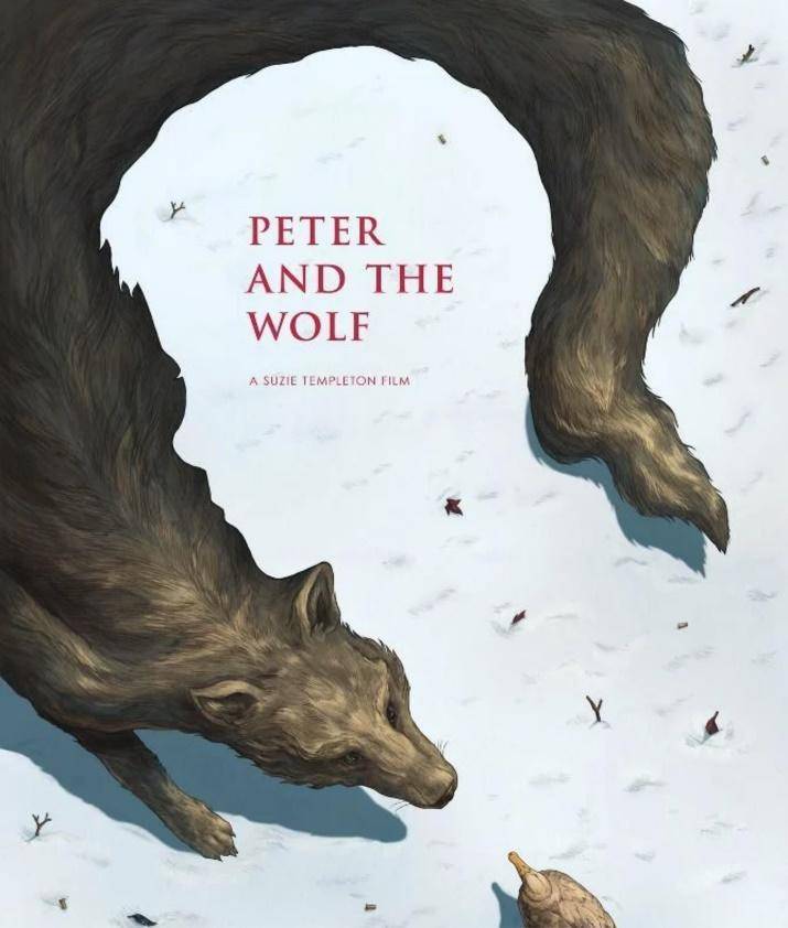 关于整体性你还可以看看下面这幅封面,它的名字叫做皮特和狼。你第一眼看到的是一个蜷着身子的灰狼和它面前的鸭子,皮特并未直接被画在画面里。但你仔细看看可以发现,人脸的侧影巧妙地用狼的尾巴给勾勒了出来。