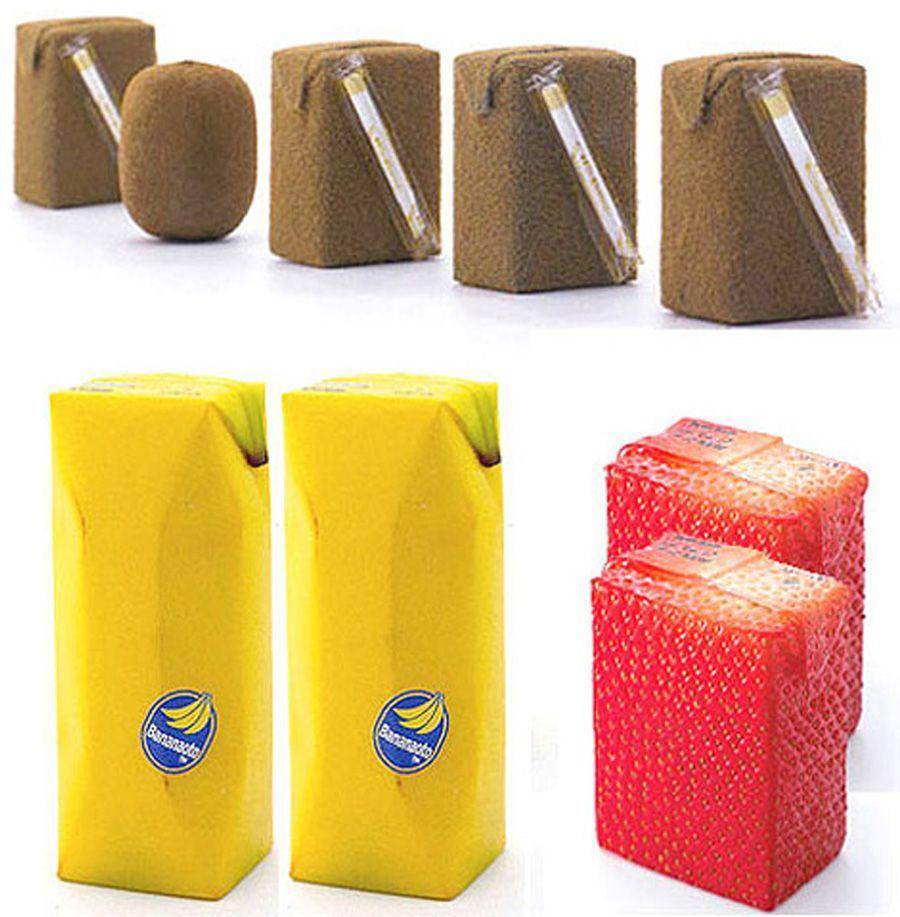 二是深泽直人设计的果汁盒。这种果汁盒在维持铝箔包装的方形外貌的基础上,添加了水果的特征,增加人的味觉联觉感受。猕猴桃样子的外包装除了色彩像猕猴桃之外,材质感也是毛茸茸的,让人胃口大开。