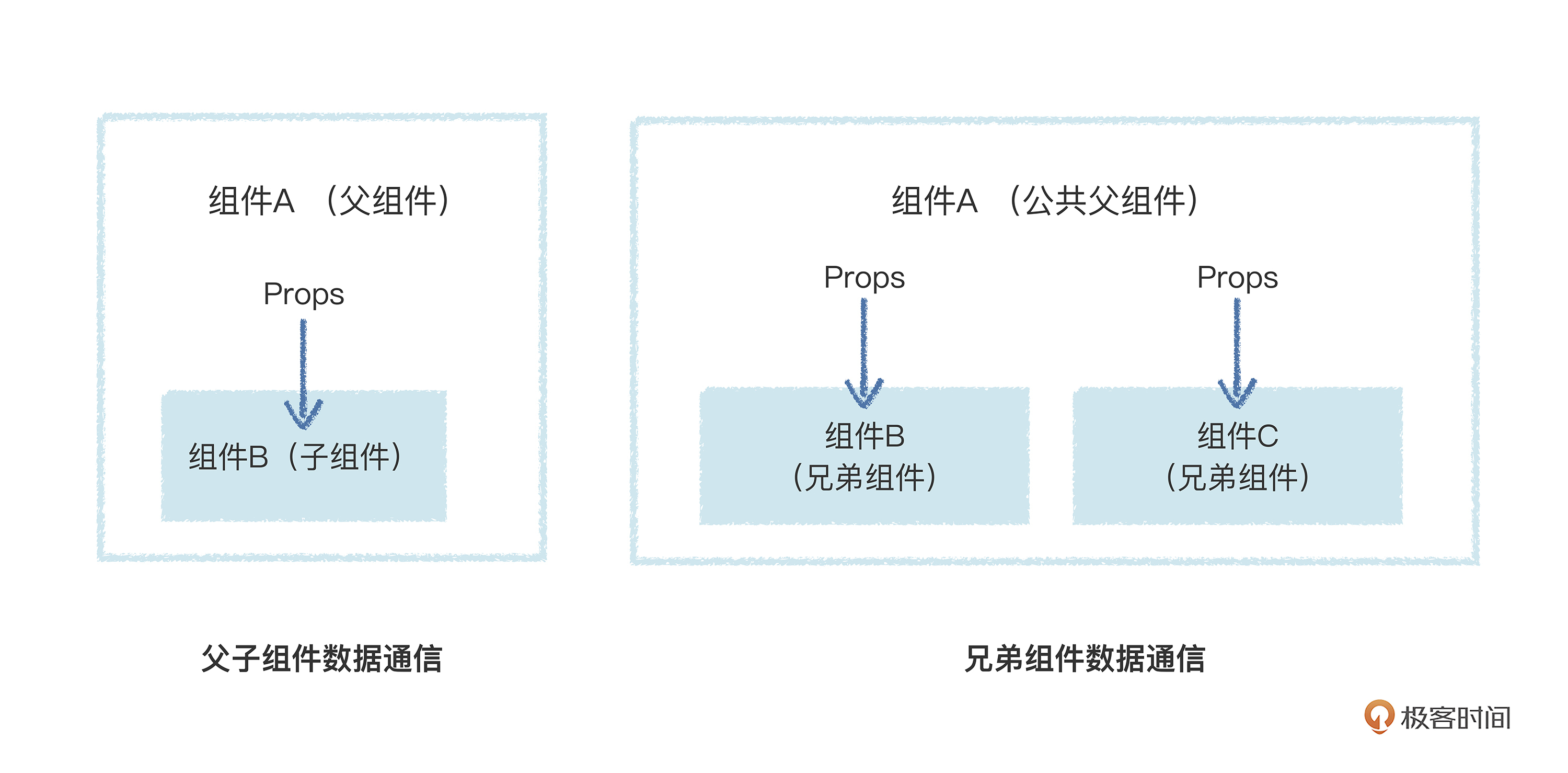 在 Vue.js 中实现“父子组件”和“兄弟组件”数据单向数据通信,一般都是通过Props来进行的。“父组件”通过Props传入数据给“子组件”,而“兄弟组件”是基于“公共父组件”通过Props将数据传入子“兄弟组件”中,例如下图所示: