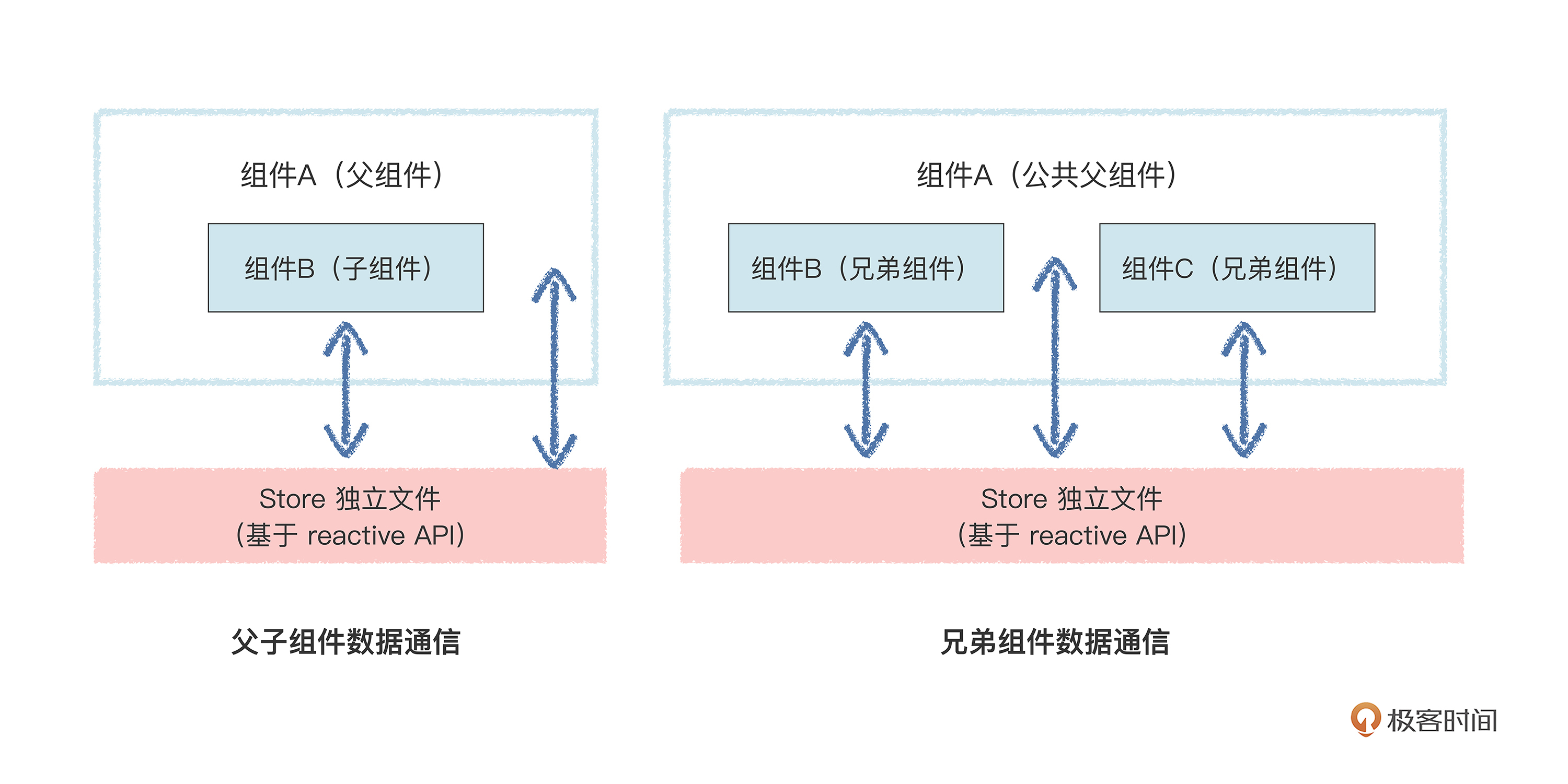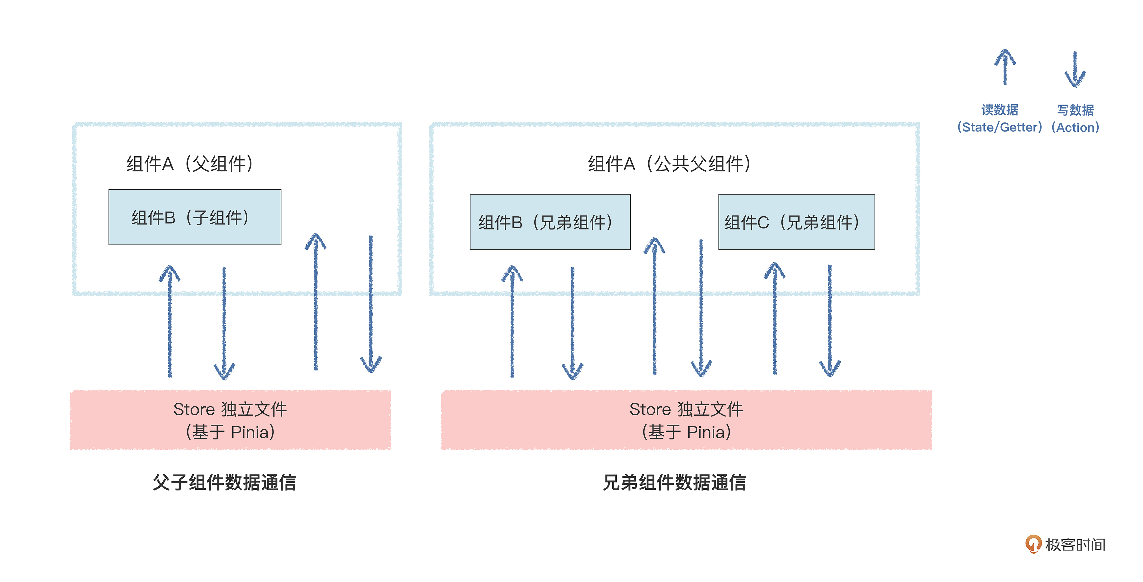 这种方法也就是响应式数据不通过Props传递,而是通过“组合方式”使用,这也是发挥了“响应式数据”+“组合式API” 的双重优势。我先给你画个图讲解一下: