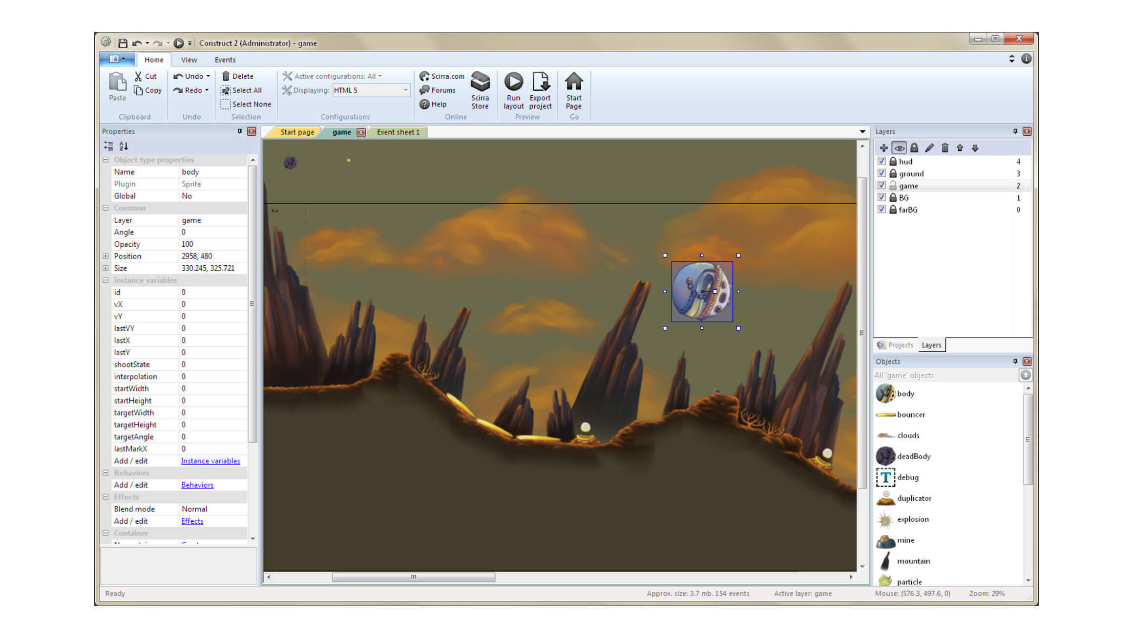 这是一款收费的引擎,当然也有免费的版本,但是免费的版本不可用于商业用途。那么既然是商用引擎,那它一定会比免费开源的产品更加完善和易用。这里有一幅Construct 2的截图,你可以看一下它的界面。
