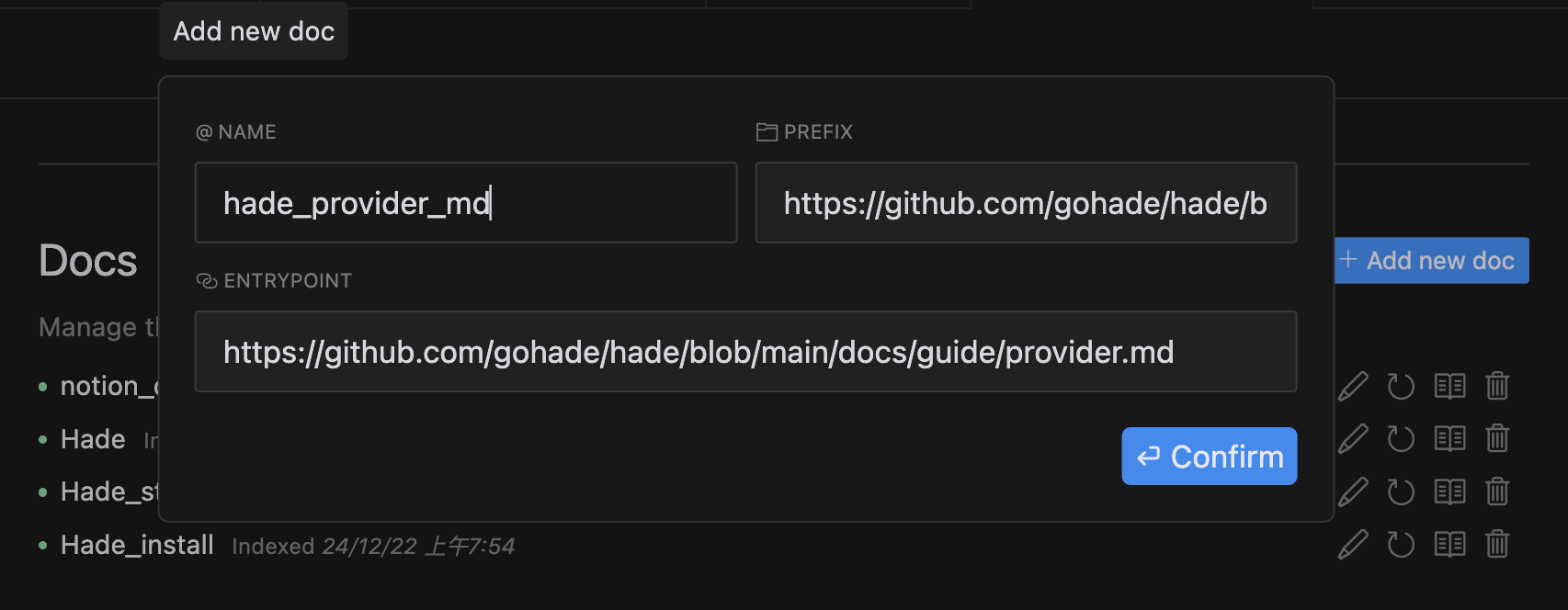 Docs 是一个很强大的能力。我们在开发过程中经常需要引用一些第三方的接口,而这些第三方的接口是有官方文档的。比如下面我要创建一个gohade 框架的 provider,我们希望 Cursor 先阅读下官方文档 https://github.com/gohade/hade/blob/main/docs/guide/provider.md,并参考这篇文档创建一个 student provider。我们可以在配置文件中的 Docs 部分先增加这个文档源,并命名为 hade_provider_md。