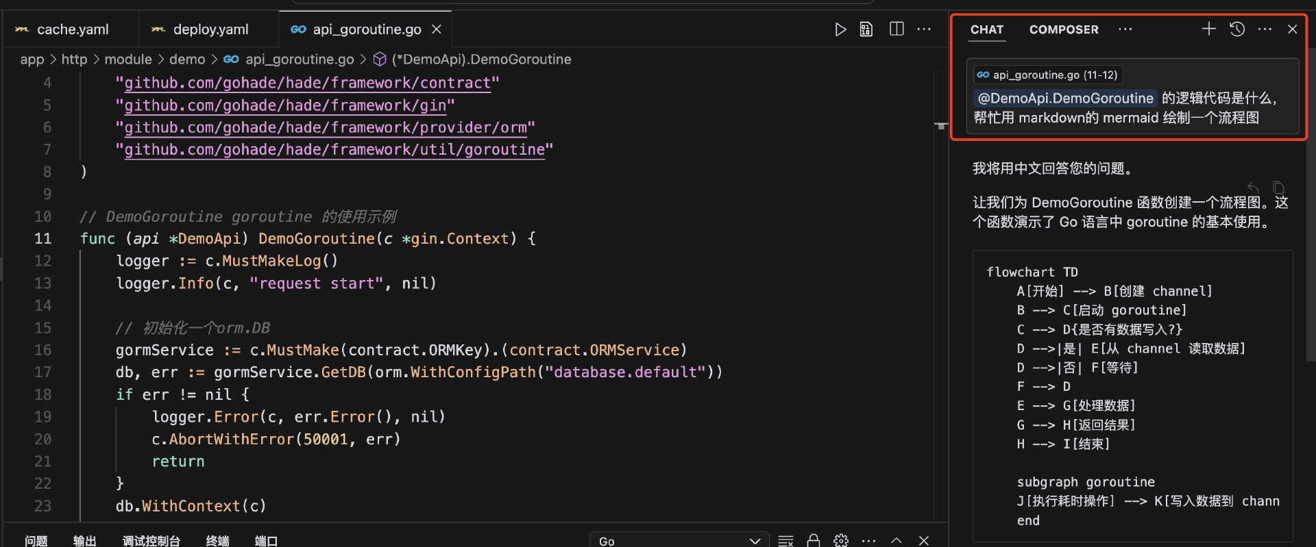 比如,我们现在需要 Composer 来修改 api_goroutine.go 这个文件,将其中的所有函数都带上注释说明。