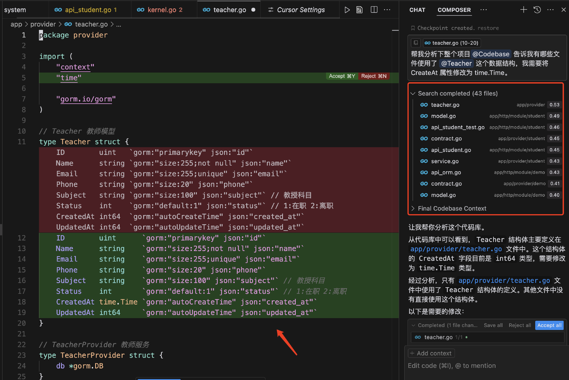 提示词可以是:帮我分析下整个项目 @Codebase,告诉我有哪些文件使用了 @Teacher 这个数据结构,我需要将 CreateAt 属性修改为 time.Time。