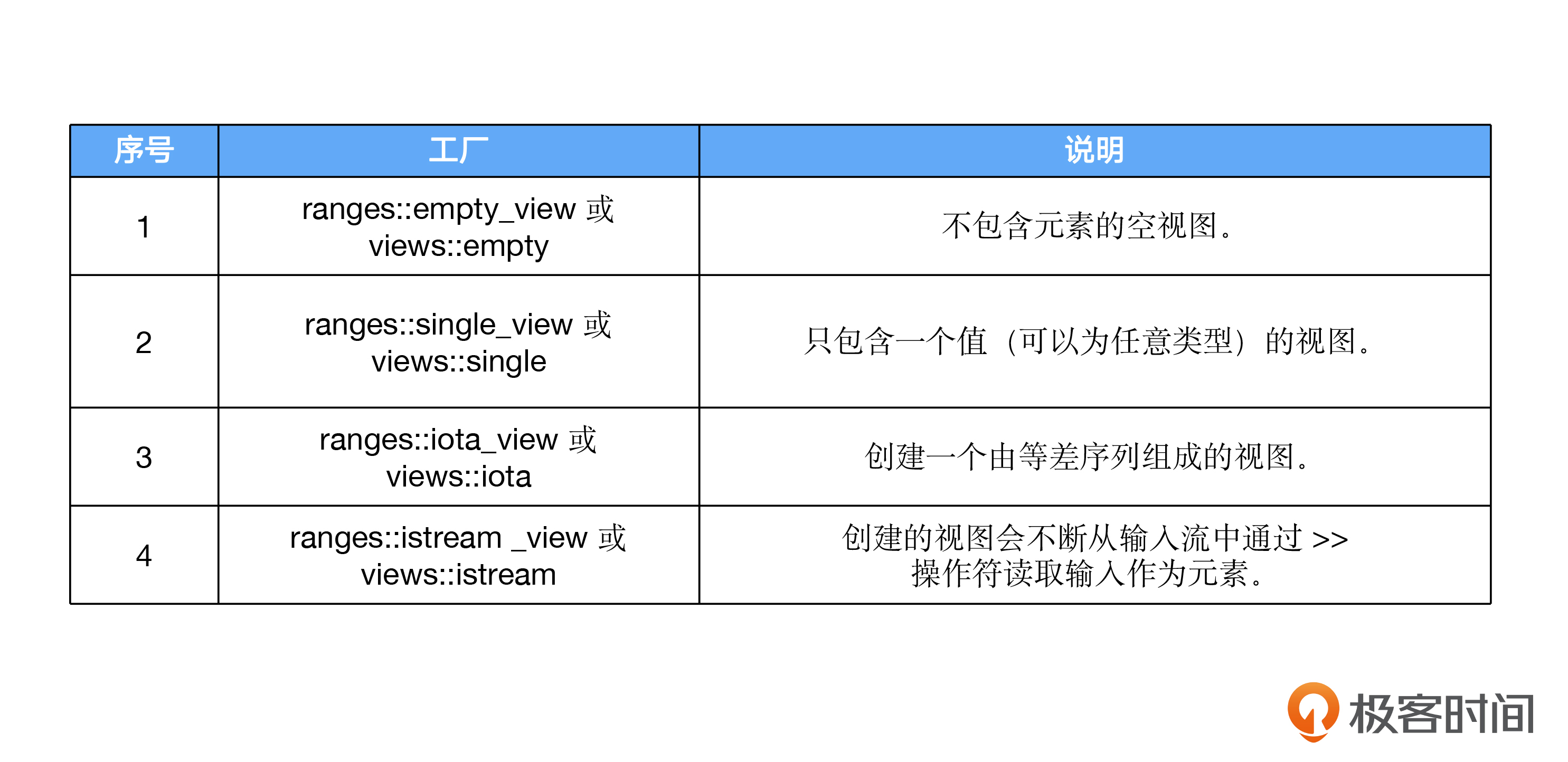由此可见,使用视图工厂是非常简单的。后面表格里整理了C++20中提供的所有工厂,供你参考。