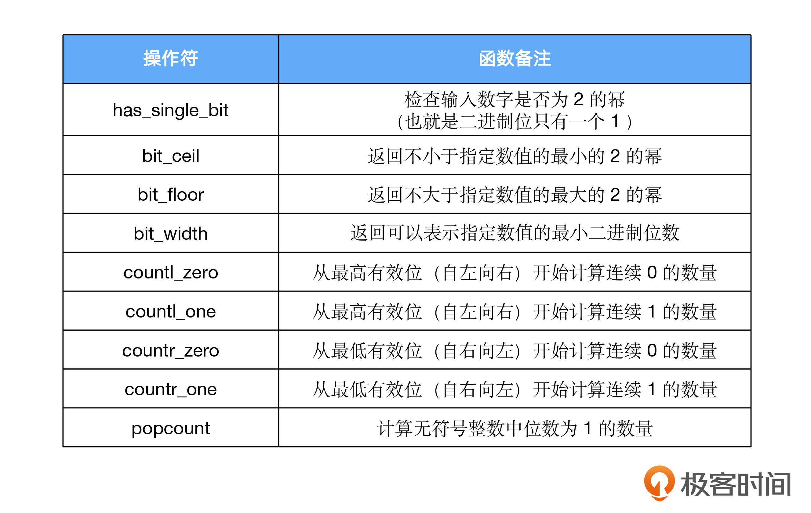 除了上述位操作支持,C++20还提供了一些其他简单的位操作函数,我用表格进行了总结。