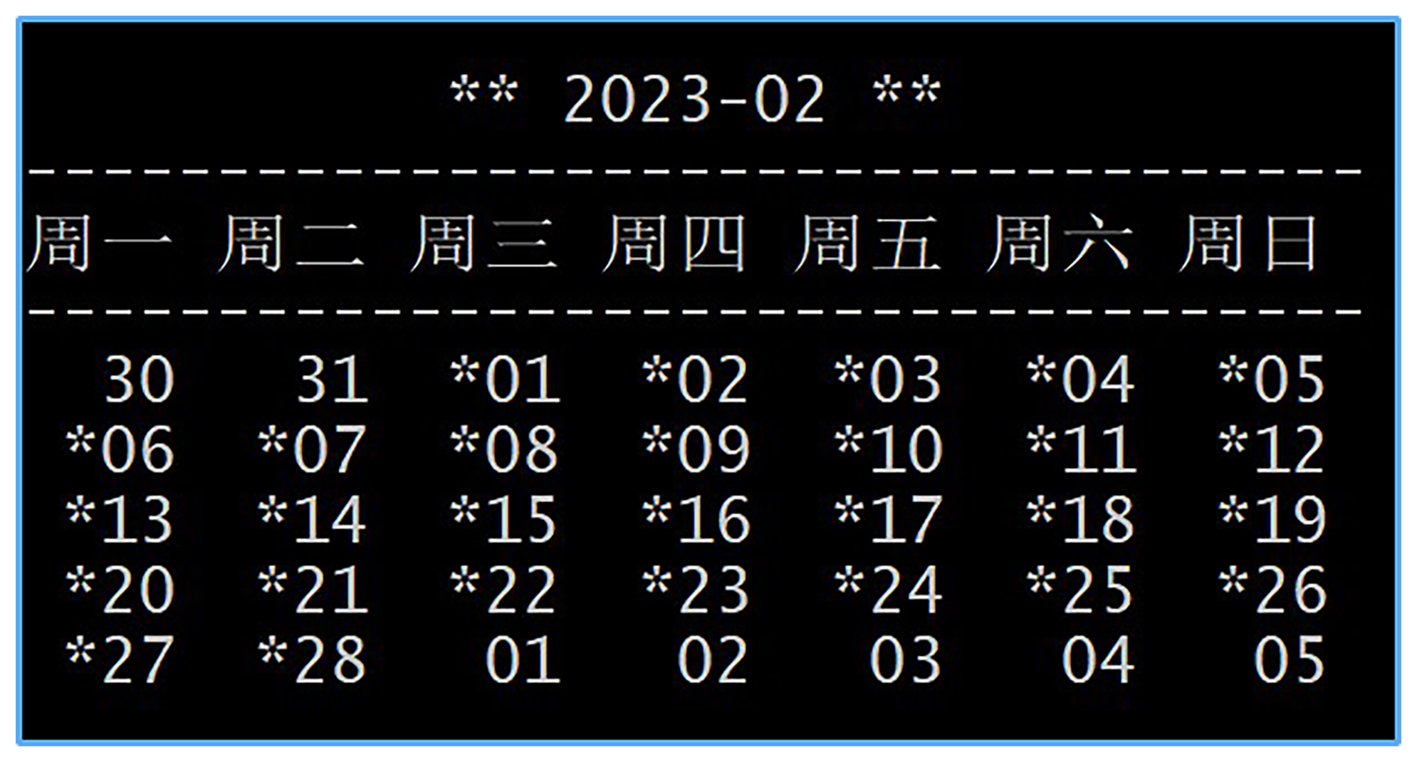 - 使用C++20 chrono:支持显示本月日历,显示日期和星期信息。