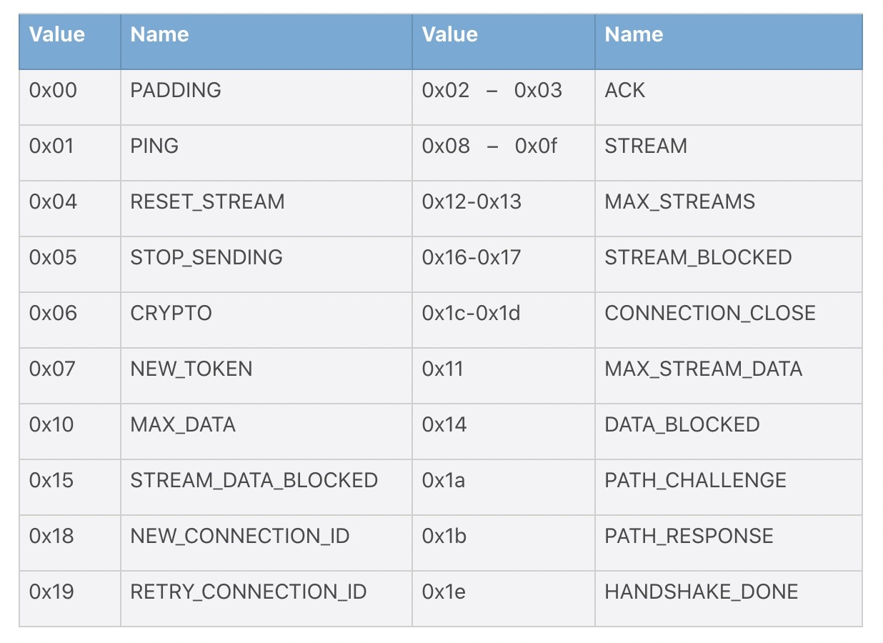 前4个字节的Frame Type字段描述的类型不同,接下来的编码也不相同,下表是各类Frame的16进制Type值: