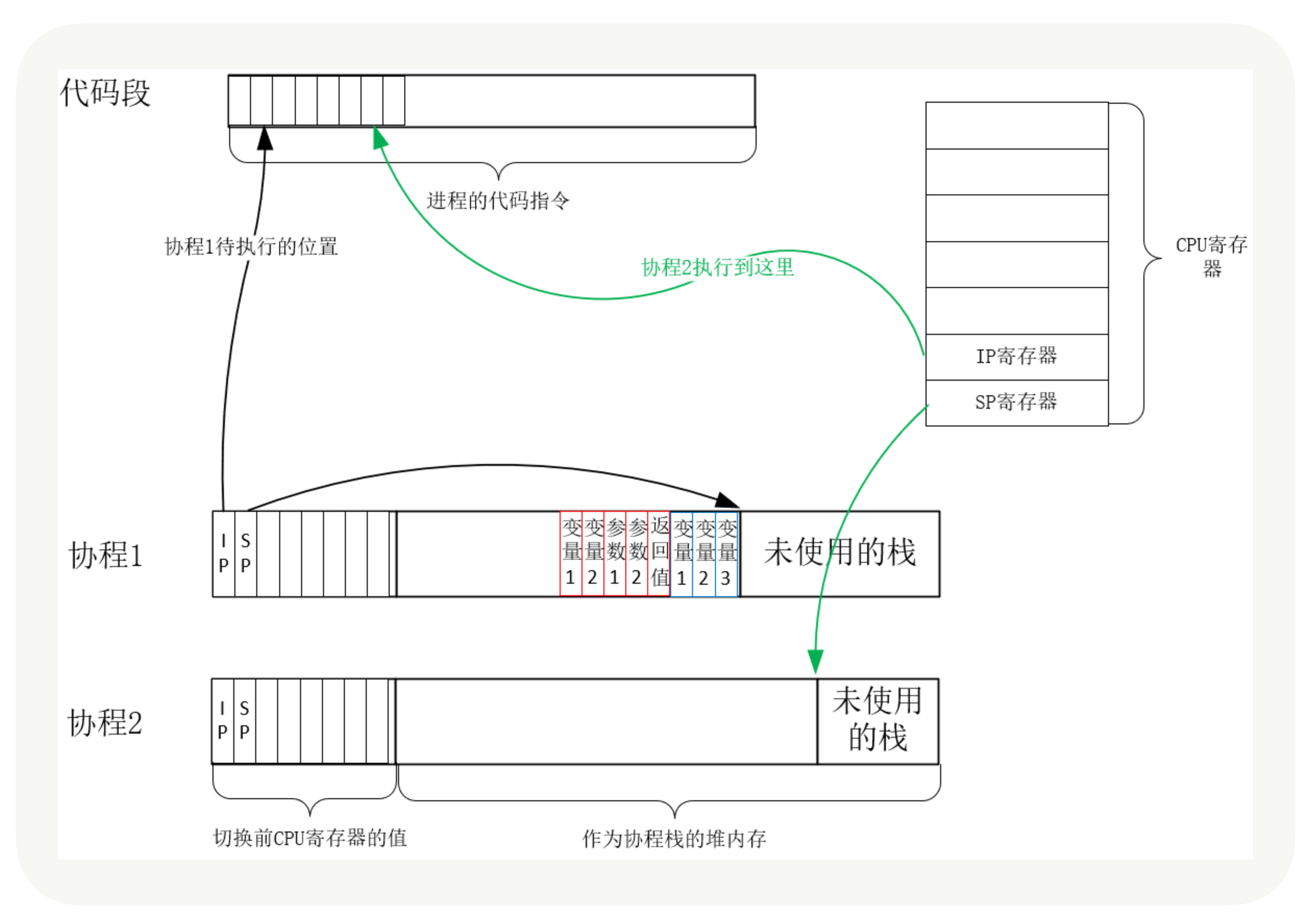 实际上,用户态的代码切换协程,与内核切换线程的原理是一样的。内核通过管理CPU的寄存器来切换线程,我们以最重要的栈寄存器和指令寄存器为例,看看协程切换时如何切换程序指令与内存。