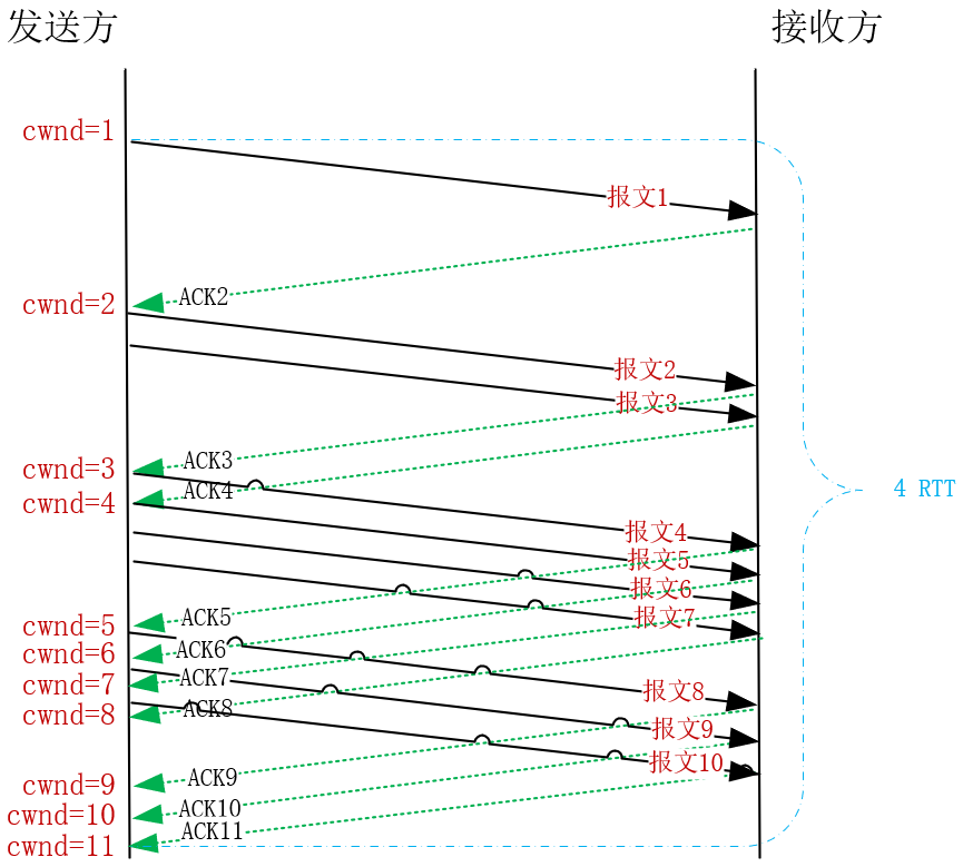 如果初始拥塞窗口只有1个MSS,当MSS是1KB,而RTT时延是100ms时,发送速度只有10KB/s。所以,当没有发生拥塞时,拥塞窗口必须快速扩大,才能提高互联网的传输速度。因此,慢启动阶段会以指数级扩大拥塞窗口(扩大规则是这样的:发送方每收到一个ACK确认报文,拥塞窗口就增加1个MSS),比如最初的初始拥塞窗口(也称为initcwnd)是1个MSS,经过4个RTT就会变成16个MSS。