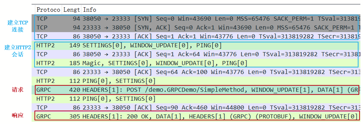 发起RPC调用后,我们可以这么分析抓取到的网络报文。首先,分析应用层最外层的HTTP/2帧,根据Stream ID找出一次RPC调用。客户端HTTP头部的path字段指明了service和RPC方法名,而content-type则指明了消息的编码格式。服务器端的HTTP头部被分成2次发送,其中DATA帧发送完毕后,才会发送grpc-status头部,这样可以明确最终的错误码。