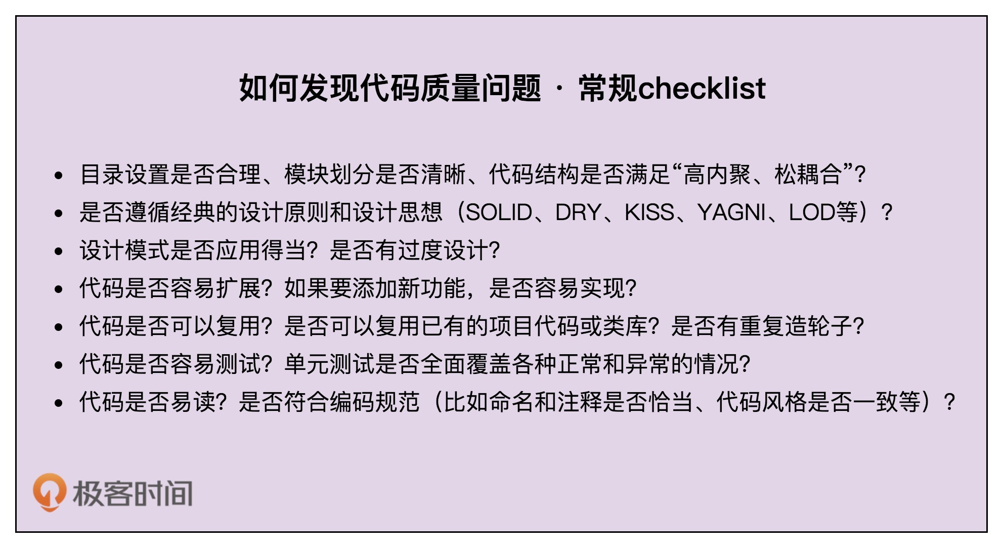 今天我们其实就重点讲了一个问题,那就是,如何发现代码质量问题?这其实是我整理的一个发现代码质量问题的checklist。之后,你在review自己的代码时,可以参考这两个checklist来进行全面的review。