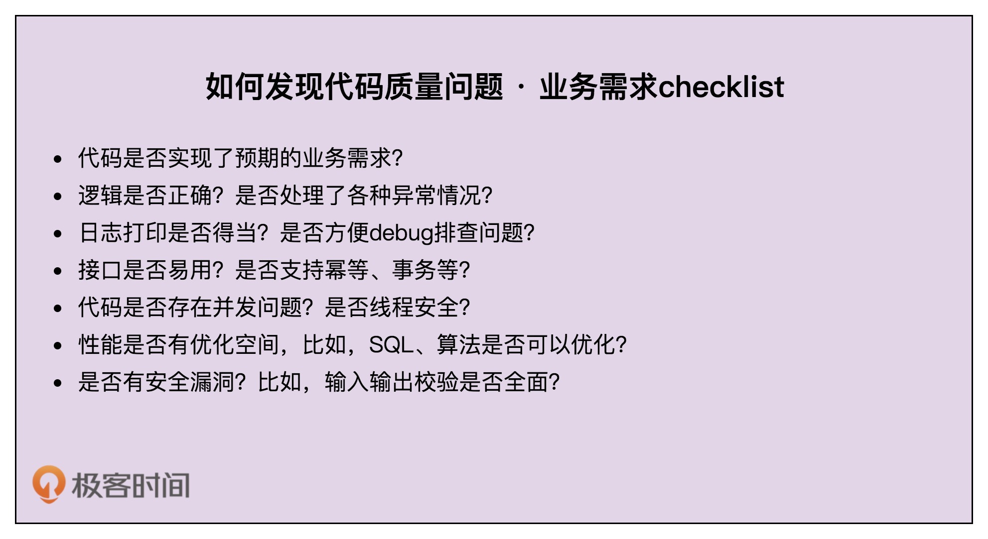 以上是一些通用的关注点,可以作为常规检查项,套用在任何代码的重构上。除此之外,我们还要关注代码实现是否满足业务本身特有的功能和非功能需求。我罗列了一些比较有共性的问题,如下所示。这份列表可能还不够全面,剩下的需要你针对具体的业务、具体的代码去具体分析。
