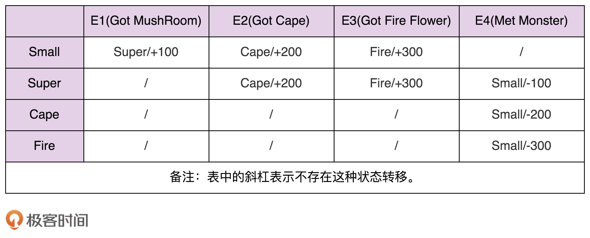 实际上,马里奥形态的转变就是一个状态机。其中,马里奥的不同形态就是状态机中的“状态”,游戏情节(比如吃了蘑菇)就是状态机中的“事件”,加减积分就是状态机中的“动作”。比如,吃蘑菇这个事件,会触发状态的转移:从小马里奥转移到超级马里奥,以及触发动作的执行(增加100积分)。
