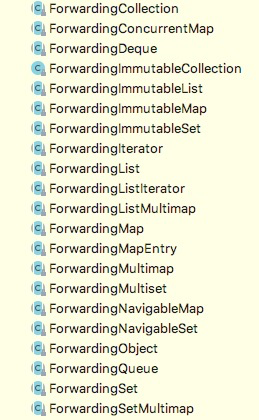 为了简化Wrapper模式的代码实现,Guava提供一系列缺省的Forwarding类。用户在实现自己的Wrapper类的时候,基于缺省的Forwarding类来扩展,就可以只实现自己关心的方法,其他不关心的方法使用缺省Forwarding类的实现,就像AddLoggingCollection类的实现那样。