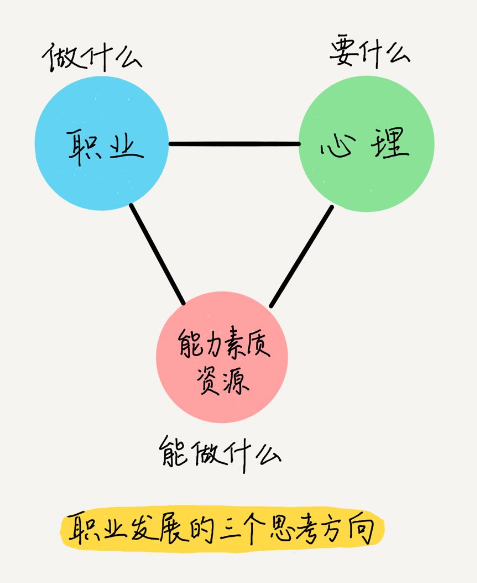- “心理愿景”体现你“要什么”。我们最先想到的往往是一种工作和生活的状态,它可以反映你心理上的满足程度(图中的“心理”这个圆)。