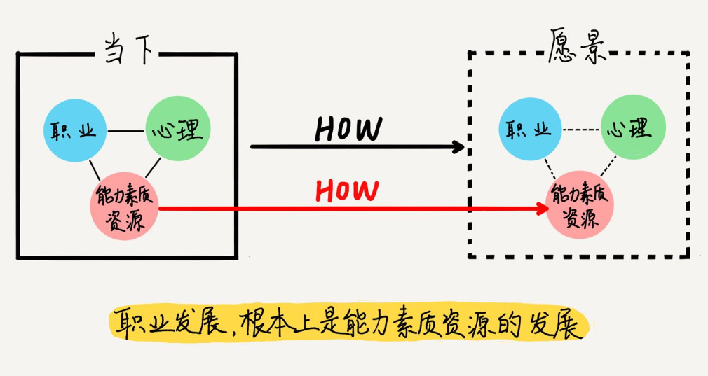 职业包含四个维度:行业、公司、职位和级别。不同职业的社会地位、经济收入、劳动付出都不同,这些会影响到第一层说的心理愿景。所以你看,如果你把心理愿景先定好了,那职业的性质也就有设定了。 - “能力素质资源愿景”体现你“能做什么”。再接下来,为了达到职业愿景,你要考虑得提高哪些能力素质和资源。比如,将来要深耕技术,或者转做管理,或者主攻业务等等,你就要考虑到能力素质资源这个角度。
