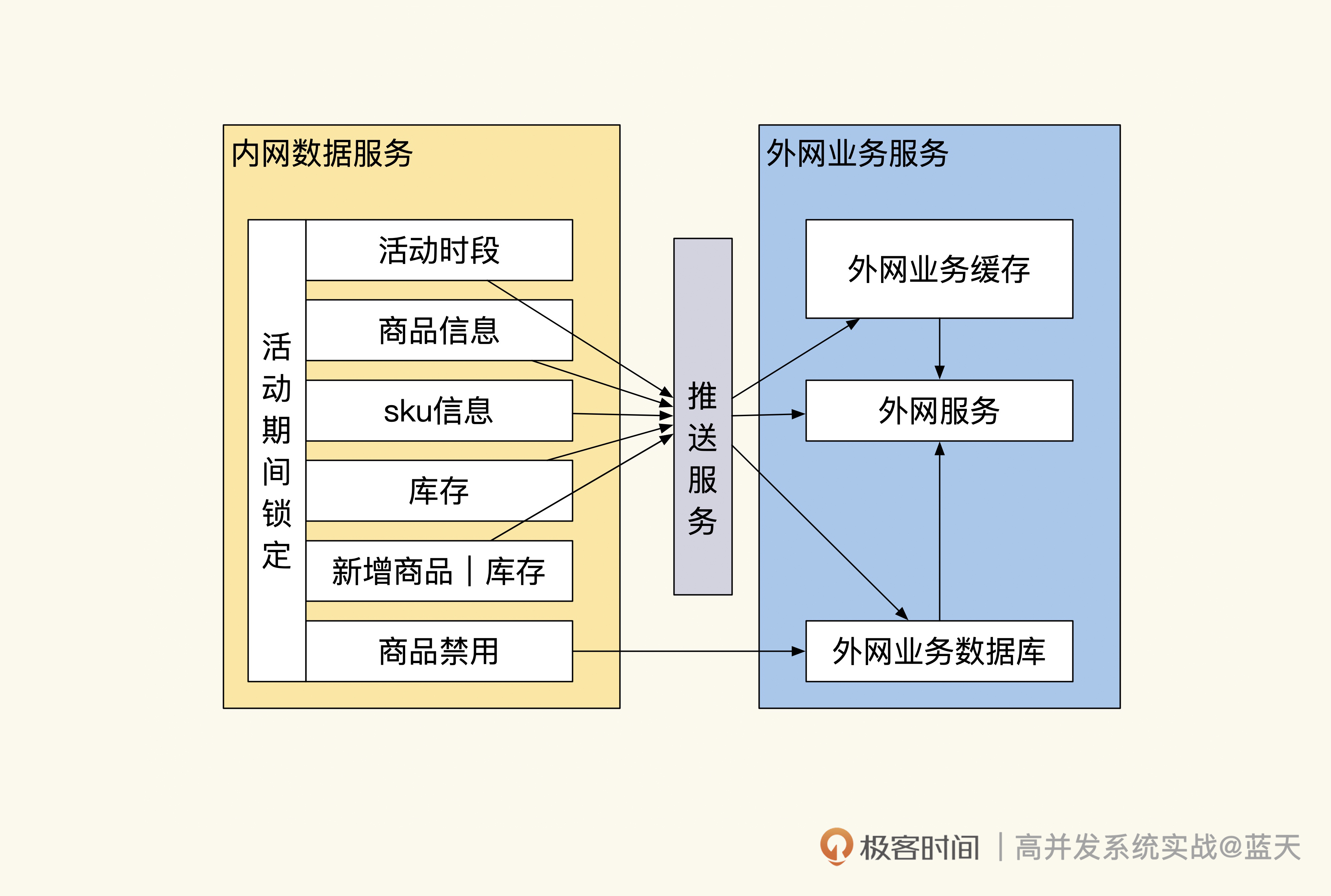 后台系统推送数据到Redis或数据库中,外网服务通过Kafka把结果同步到内网,扣减库存需通知外网服务扣减成功后方可同步操作。
