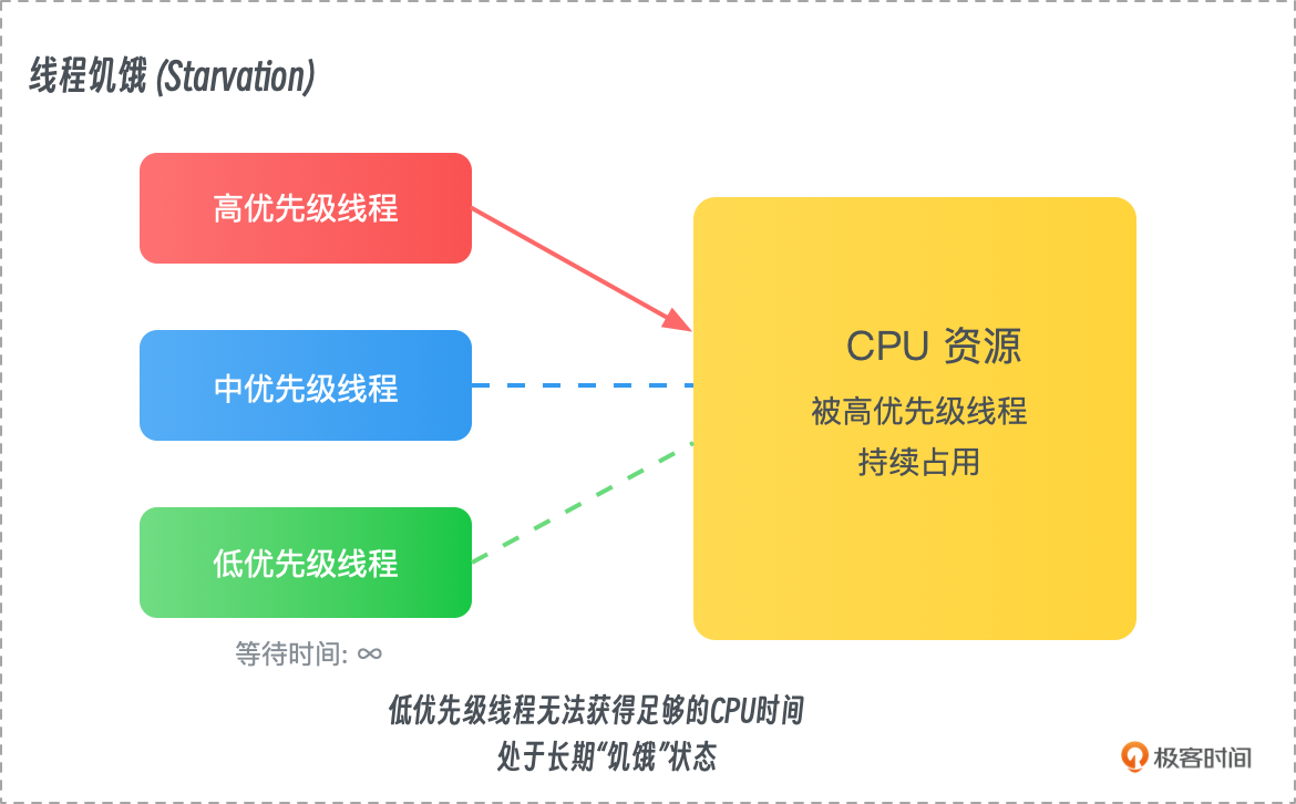 - 示例:在一个调度系统中,高优先级任务等待低优先级任务释放资源,然而中等优先级任务不断占用 CPU 时间,使得低优先级任务无法释放资源,导致高优先级任务陷入等待。