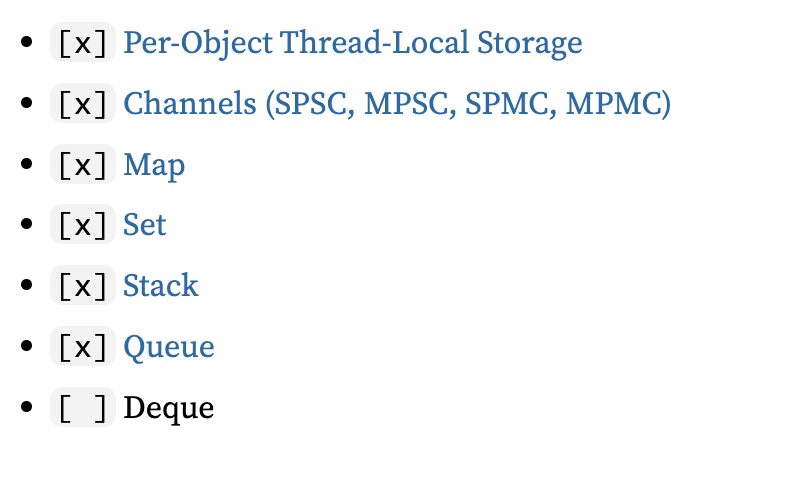 它提供了下面6种类型的并发无锁数据结构,对于通道来说,它实现了通道的四种类型。