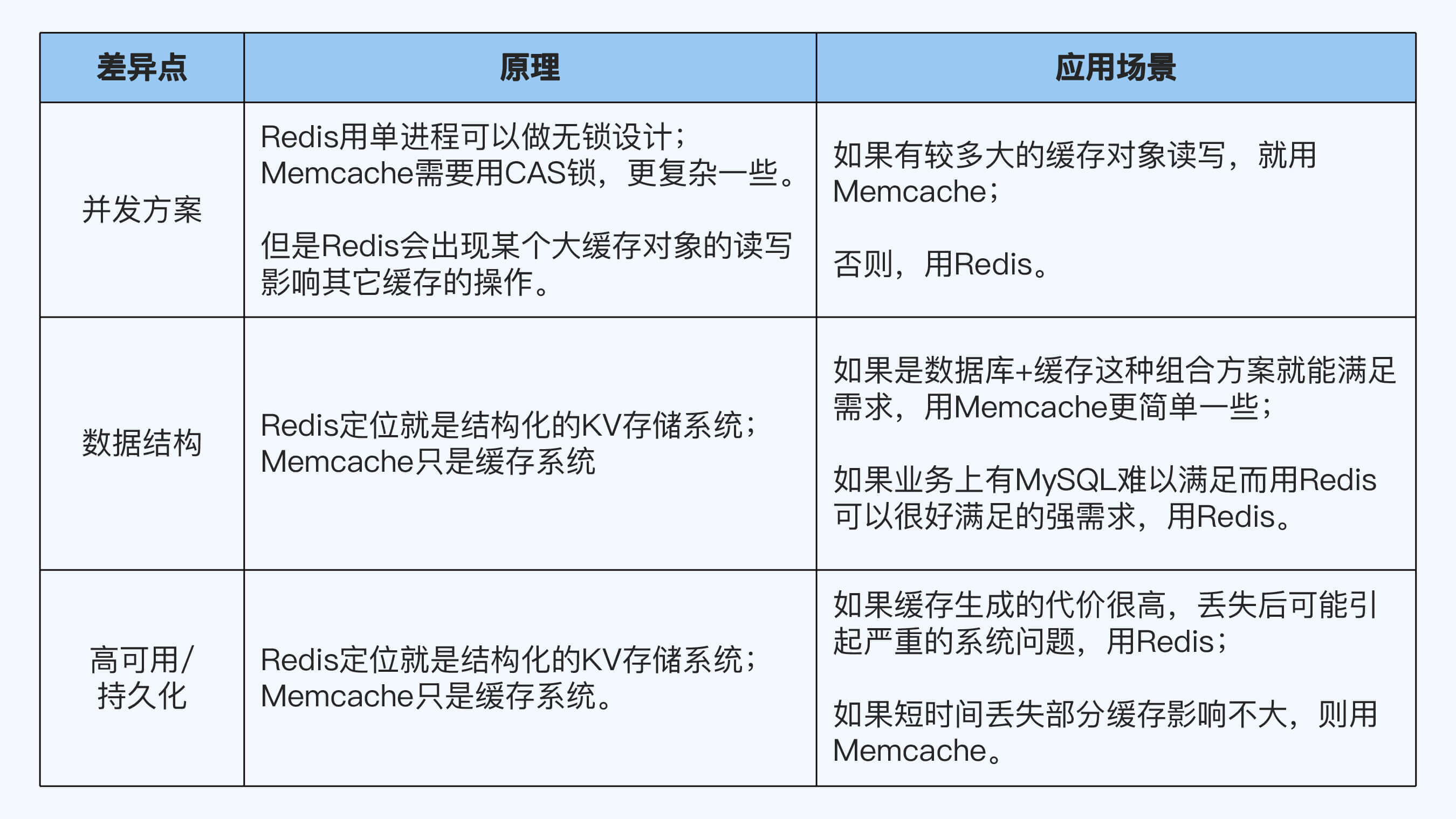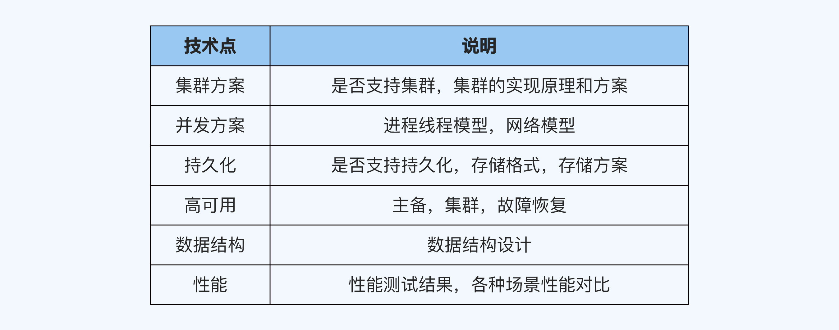 - 找出差异较大的技术点,包括并发方案、数据结构、高可用和持久化,整理出它们背后的原理和对应用场景的影响。