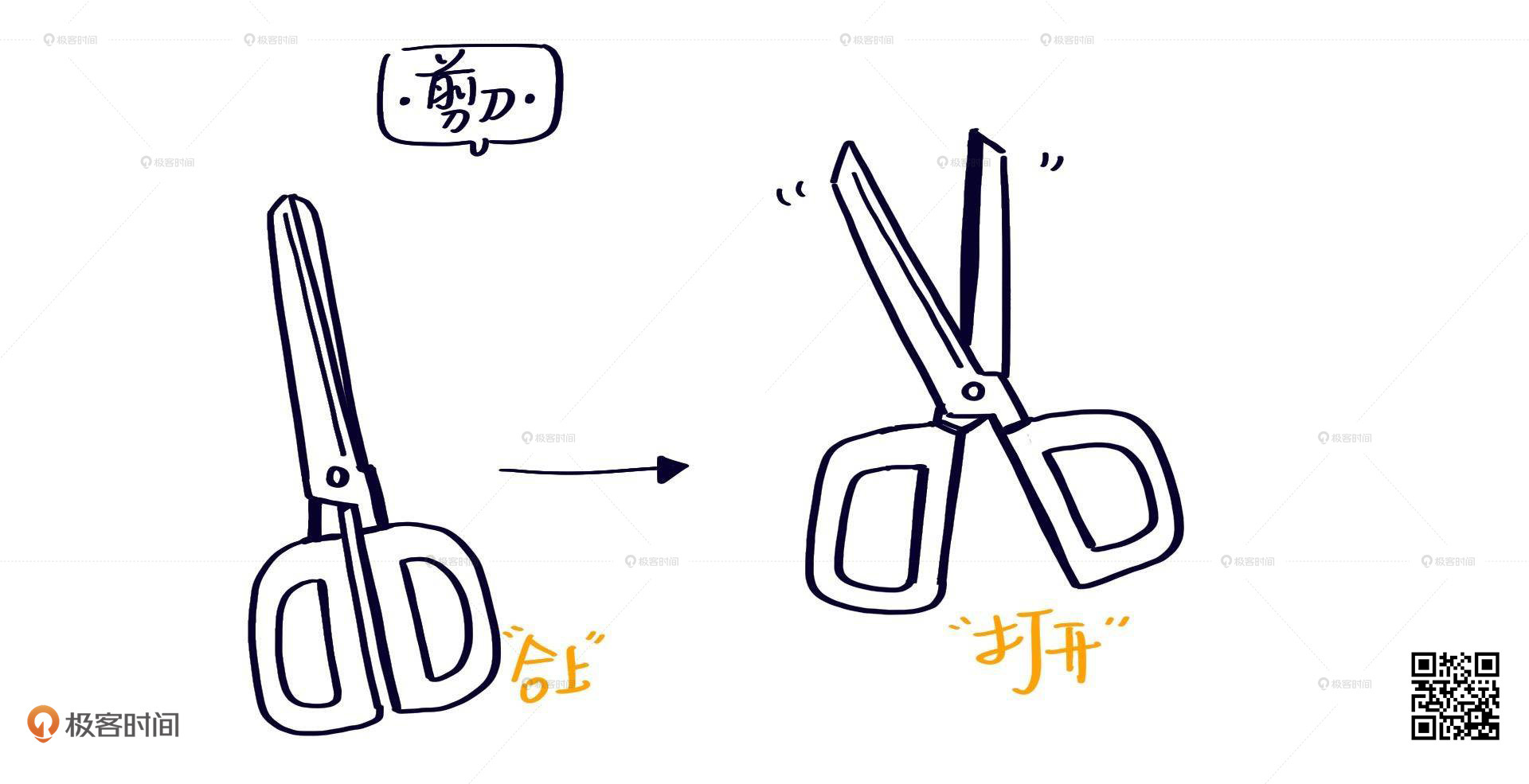 画订书机的时候只要选侧面就可以了,因为这一面最容易画。剪刀这个元素有合上和打开的两种形态,你也可以让这个元素更复杂一些,比如剪刀加手形成一个组合元素。