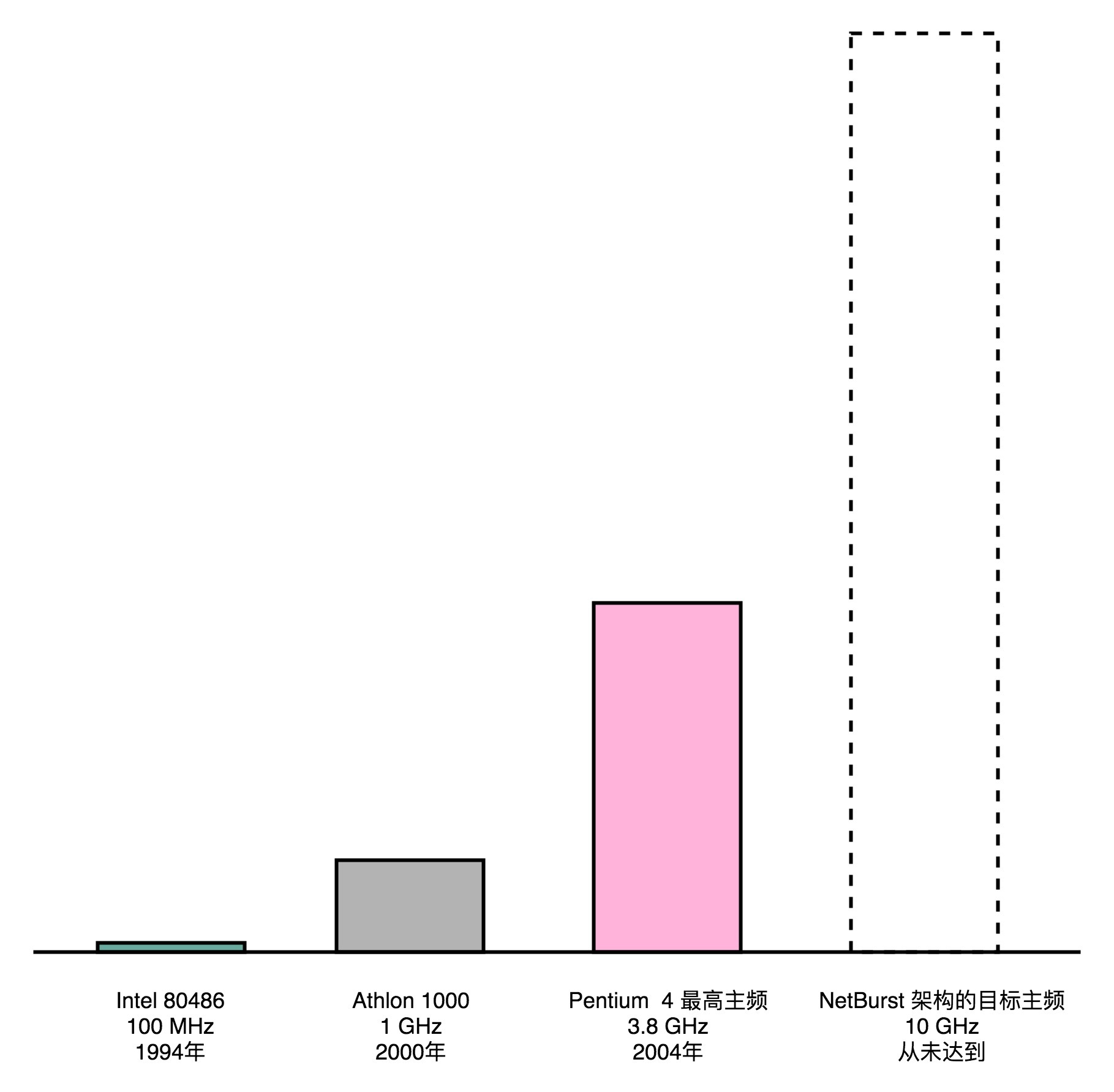 但是,跑分对于消费者来说还是太复杂了。在Pentium 4的CPU面世之前,绝大部分消费者并不是根据跑分结果来判断CPU的性能的。大家判断一个CPU的性能,通常只看CPU的主频。而CPU的厂商们也通过不停地提升主频,把主频当成技术竞赛的核心指标。