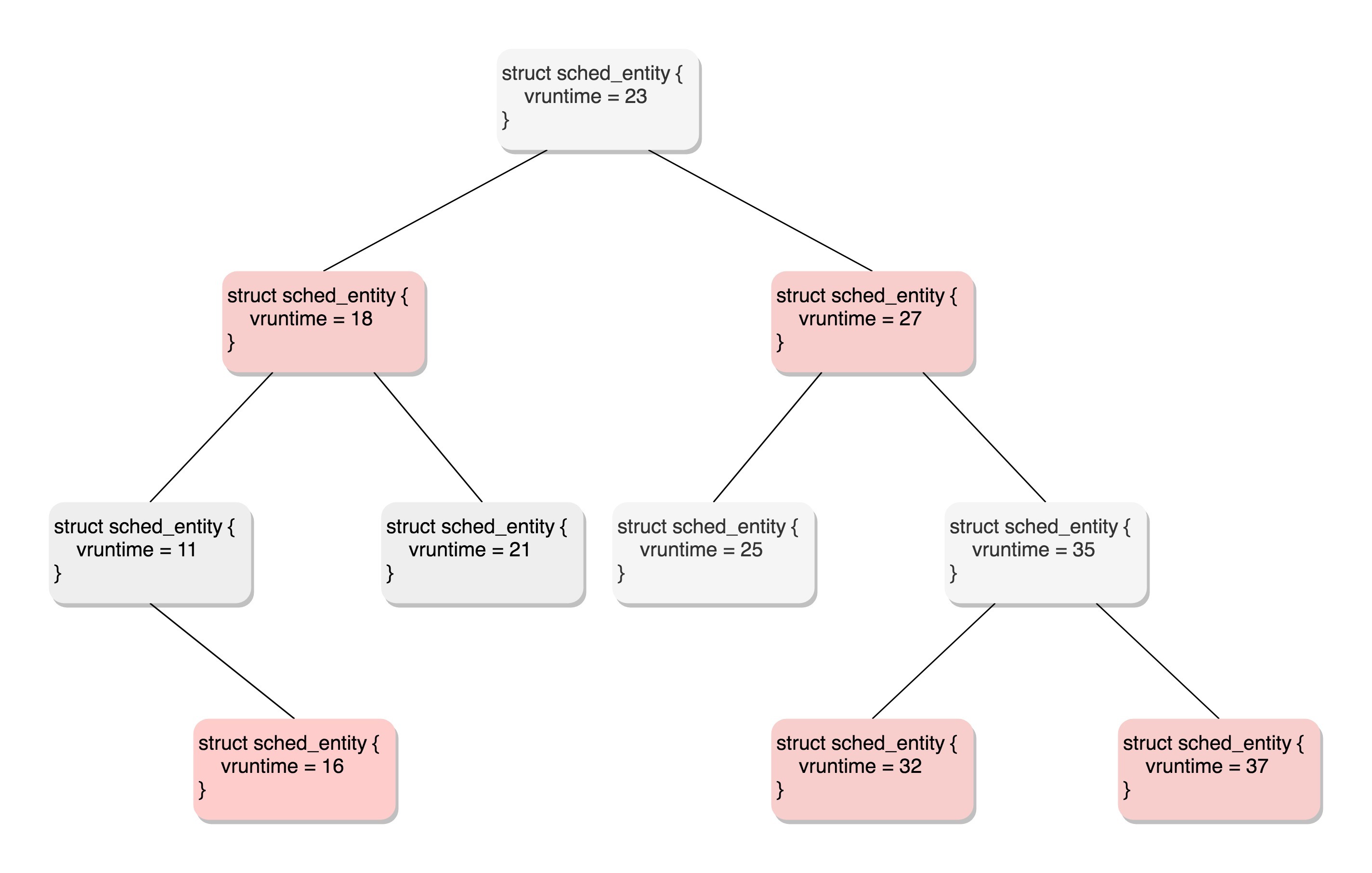 看来CFS需要一个数据结构来对vruntime进行排序,找出最小的那个。这个能够排序的数据结构不但需要查询的时候,能够快速找到最小的,更新的时候也需要能够快速地调整排序,要知道vruntime可是经常在变的,变了再插入这个数据结构,就需要重新排序。