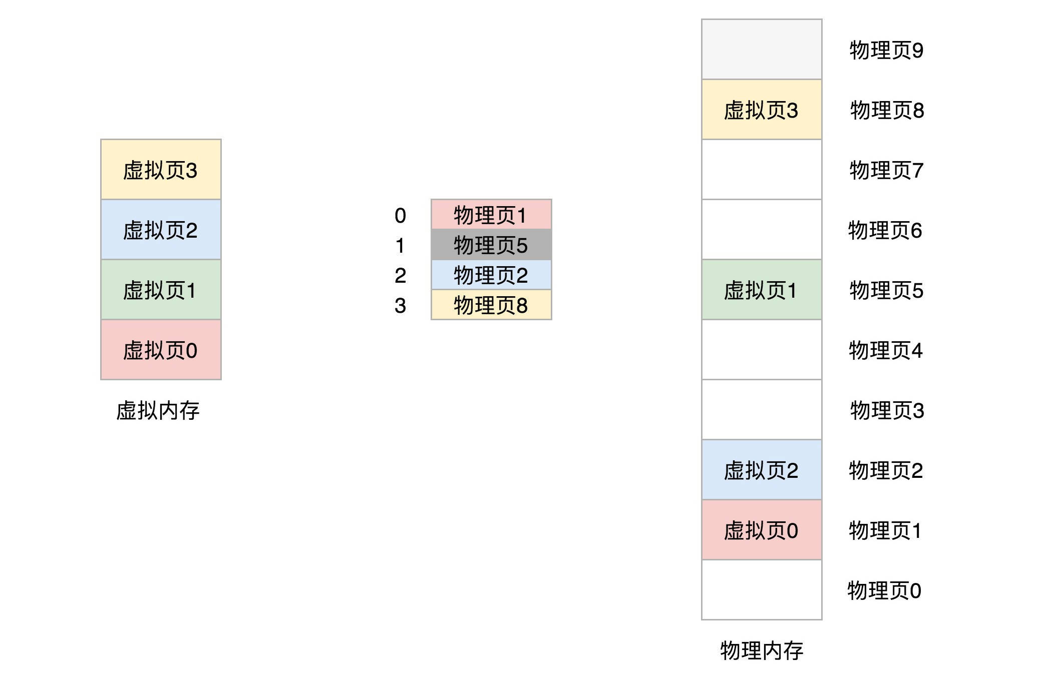 虚拟地址分为两部分,页号和页内偏移。页号作为页表的索引,页表包含物理页每页所在物理内存的基地址。这个基地址与页内偏移的组合就形成了物理内存地址。