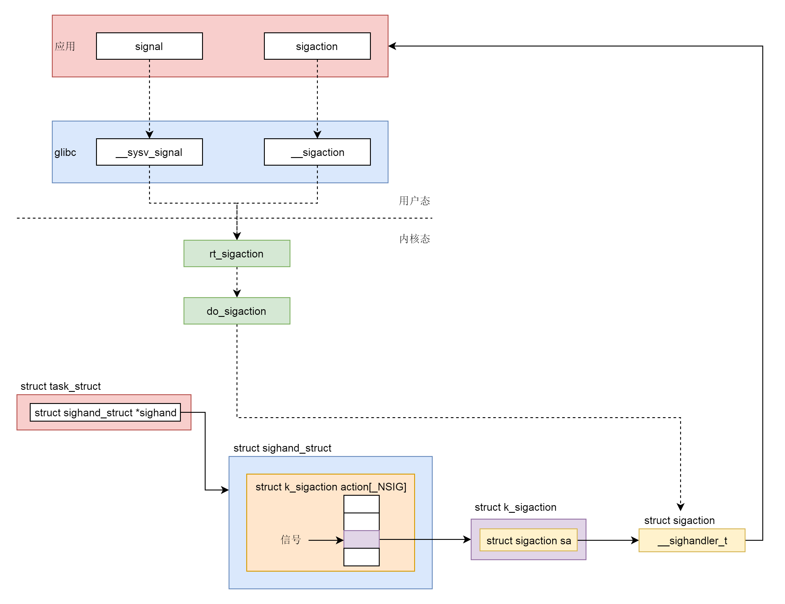 - 无论是__sysv_signal还是__sigaction,调用的都是统一的一个系统调用rt_sigaction。