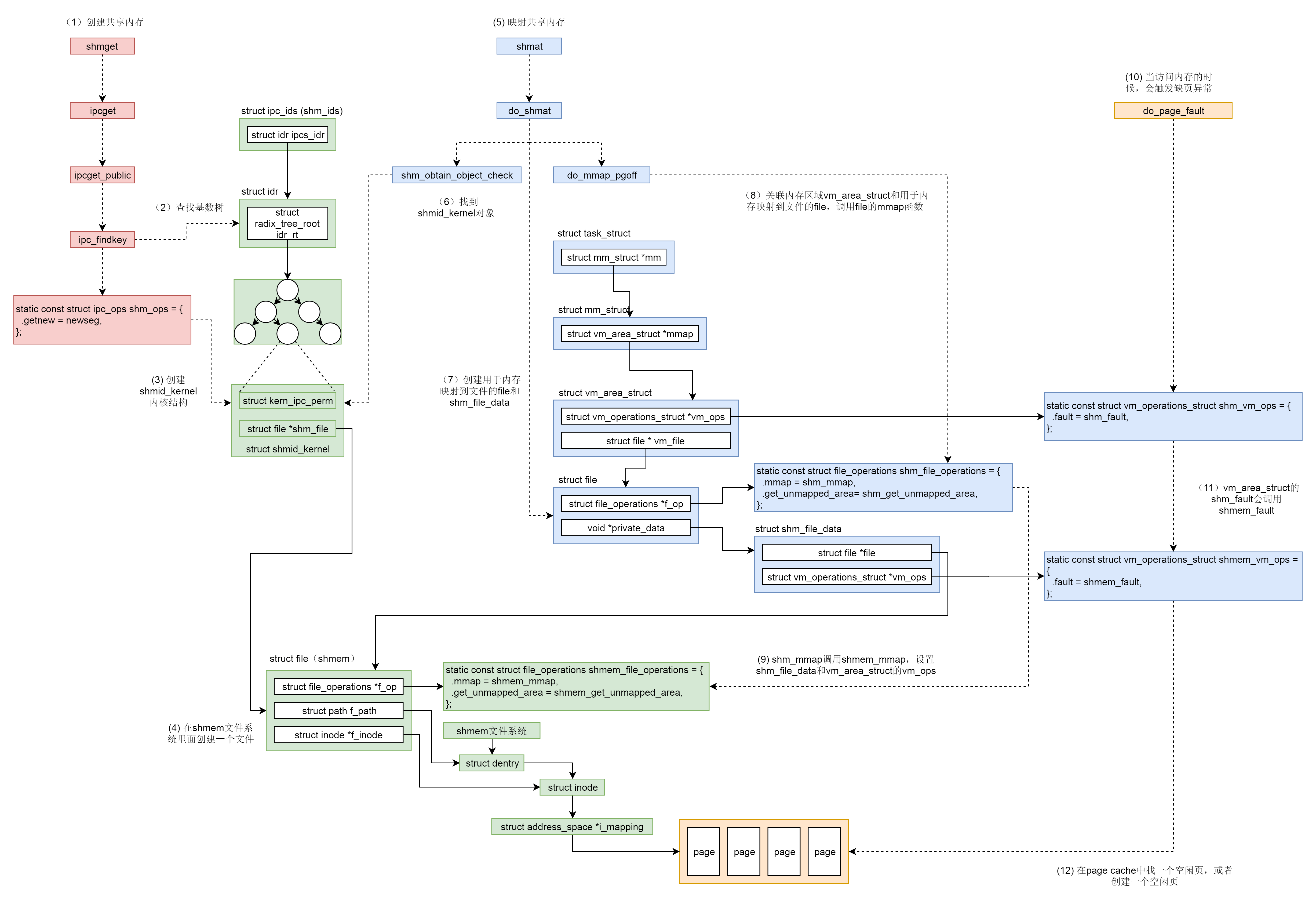 文章两遍读下来蒙蒙的,最后对着总结图把共享内存的创建和在用户态映射的流程理顺了。关键就是因为共享内存刚开始申请的物理内存无法在进程中共享,所以先要把物理内存的shmid_kernel对应到shmem文件系统的一个文件,这样shmem中的文件可以再进程中共享;然后在shmat函数时,相当于将shm映射到shmem的file2,先映射到shmem文件系统的文件file1,然后再通过file1的mmap函数完成shm_file_data和vm_area_struct的ops设置。这样内存映射完毕后,并没有真的分配物理内存,当访问内存会触发缺页异常。然后vm_area_struct的vm_ops的shm_fault会调用shm_file_data的vm_ops的shmem_fault。最后在page cache中找一个空闲页,或者创建一个空闲页。