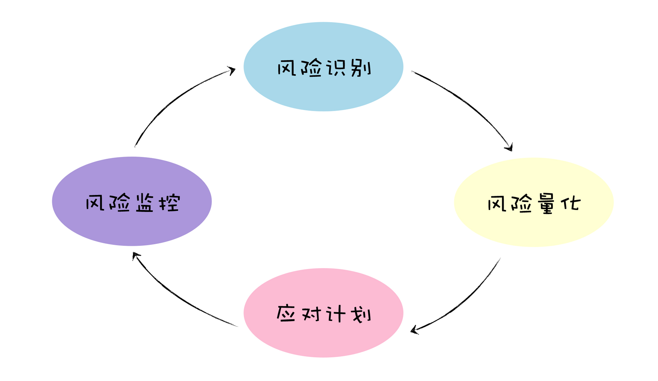 以上四个风险管理的步骤是一个连续循环的过程,在整个项目期间,都要持续地对风险进行识别,对风险量化,对于风险采取应对计划,对风险进行监控。
