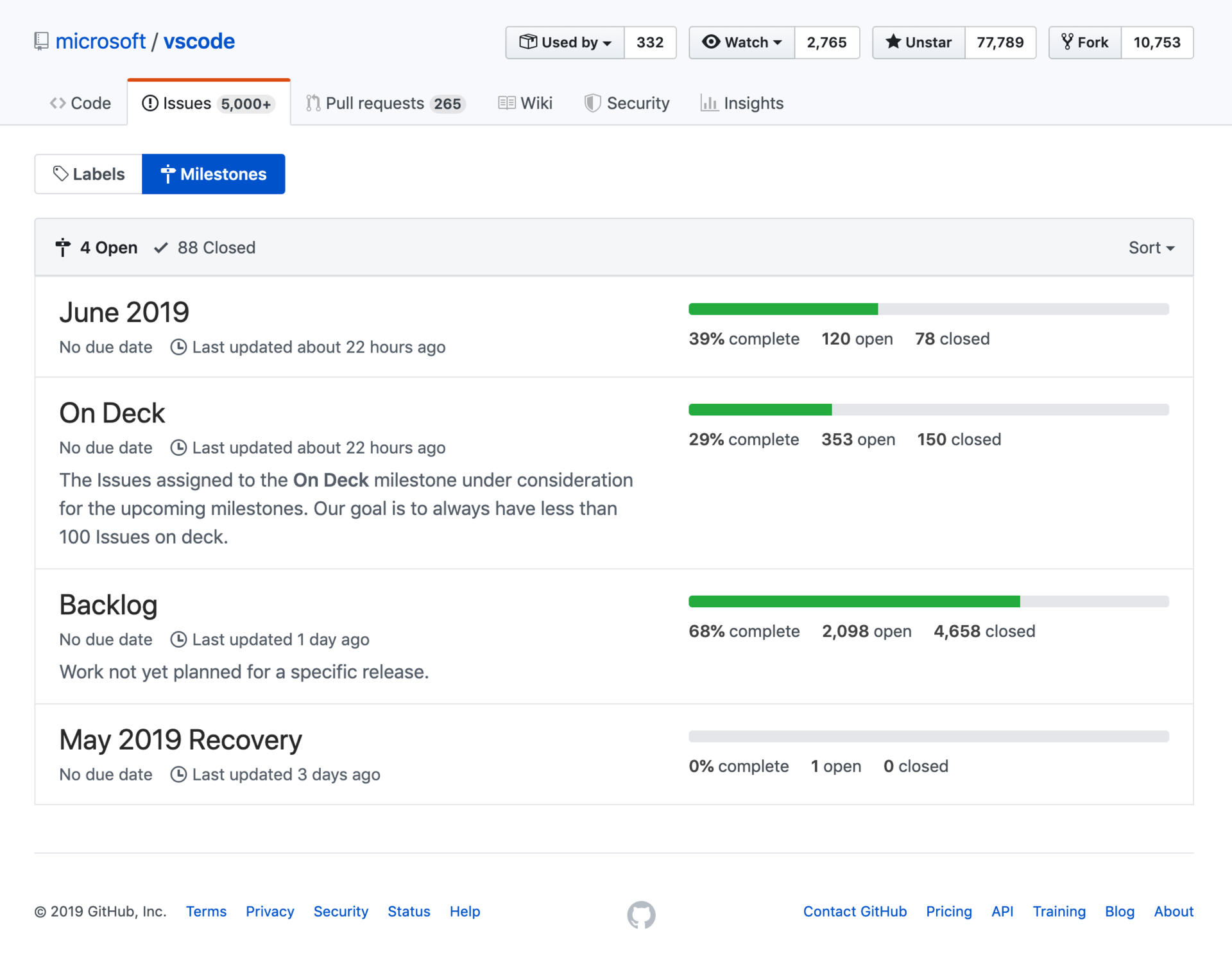 GitHub的Issue管理有一个Milestone的功能,VS Code有四个主要的Milestone。