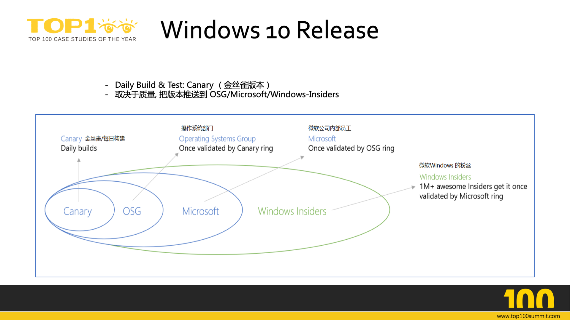 即使是像微软这样,以前要几年才发布一个版本软件的公司,现在也加快了迭代。现在Windows 10,每半年就会更新一个大的版本,每天都会发布可以测试的版本。