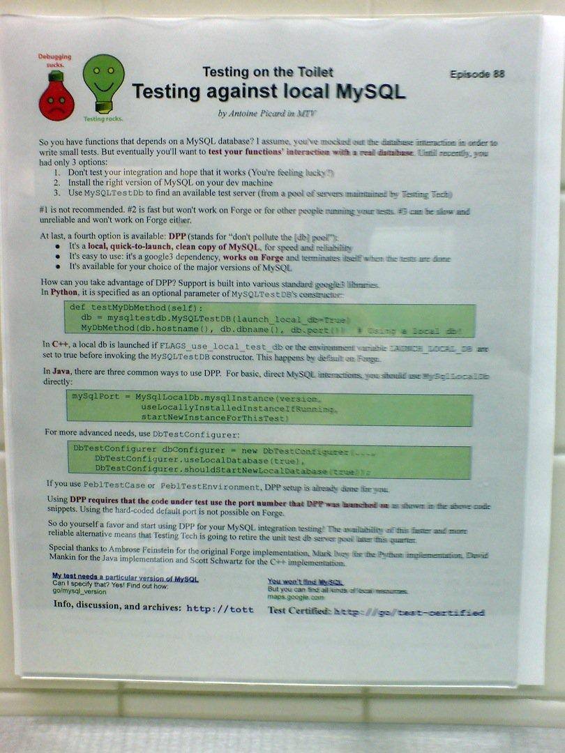 在谷歌的卫生间里面,甚至会张贴着有关Testing on the Toilet的贴纸,让你在去卫生间的时候还能学学怎么写测试,好让你的PR能早点通过审查。