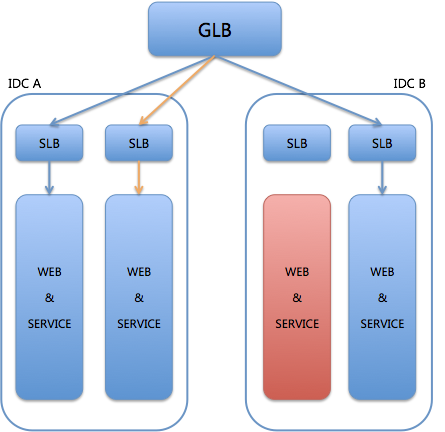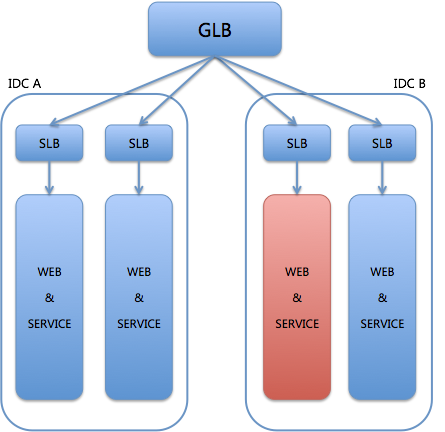 而此时,IDC A有这个服务单元的灾备存在,那么系统就会被触发流量切换,即:GLB会将所有发给故障服务单元SLB上的流量,切换到IDC A的灾备服务单元上,如图4所示。