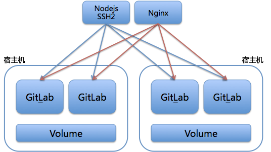 第二,同台宿主机上的GitLab实例共享一个Volume,这样就保证了即使某一个GitLab实例故障,也可以快速将流量切换到同宿主机的其他实例上,继续提供服务。