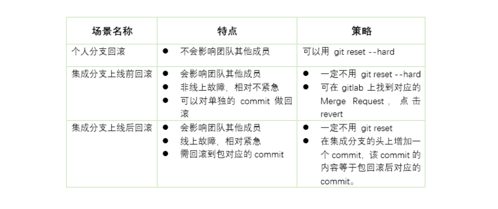 除了开发的个人分支上存在回滚的情况外,我们还会遇到集成分支上需要回滚的情况;对于集成分支的回滚,又可以分为上线前和上线后两种情况;因为紧急程度和上线情况的不同,我们必须采用不同的回滚策略。