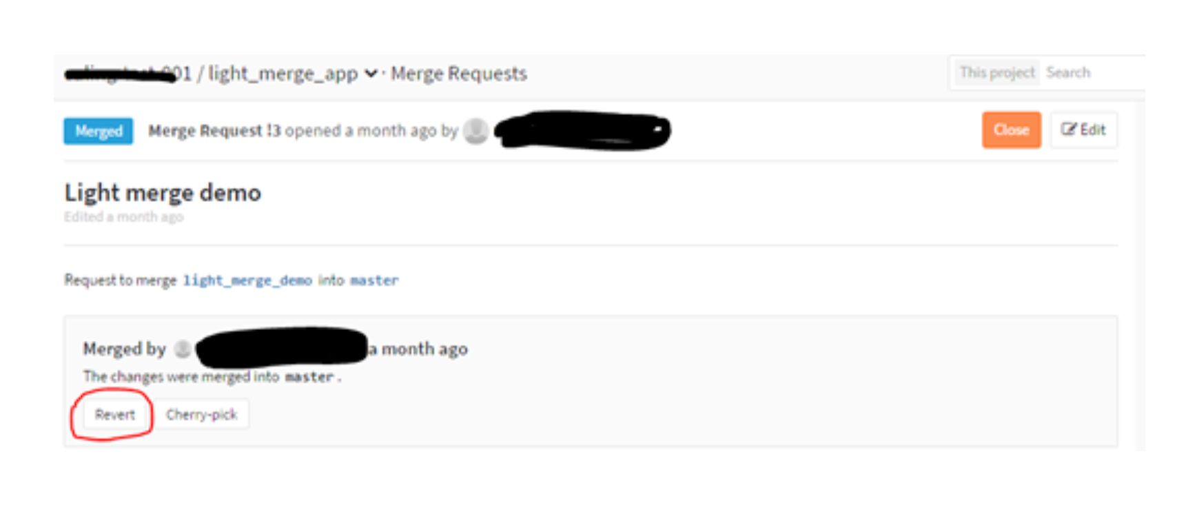- 团队成员可以在 GitLab 上找到C4和C6合入master的合并请求,然后点击 revert 。如图4所示。