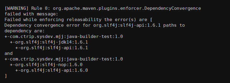 org.slf4j:slf4j-jdk14:1.6.1依赖了 org.slf4j:slf4j-api:1.6.1, 而 org.slf4j:slf4j-nop:1.6.0依赖了 org.slf4j:slf4j-api:1.6.0,当我们在构建项目时, 便会有如下错误: