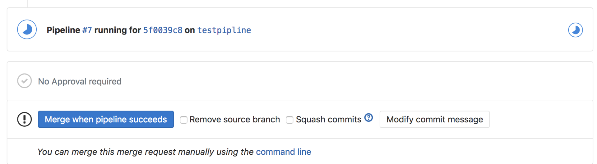 从GitLab中获取当前Merge Request源分支的代码;同时,通Jenkins GitLab插件将Merge Request所在的分支的当前commit状态置为running。这个时候,我们可以在GitLab的页面上看到Merge Request的合并选项已经被限制了,如图5所示。