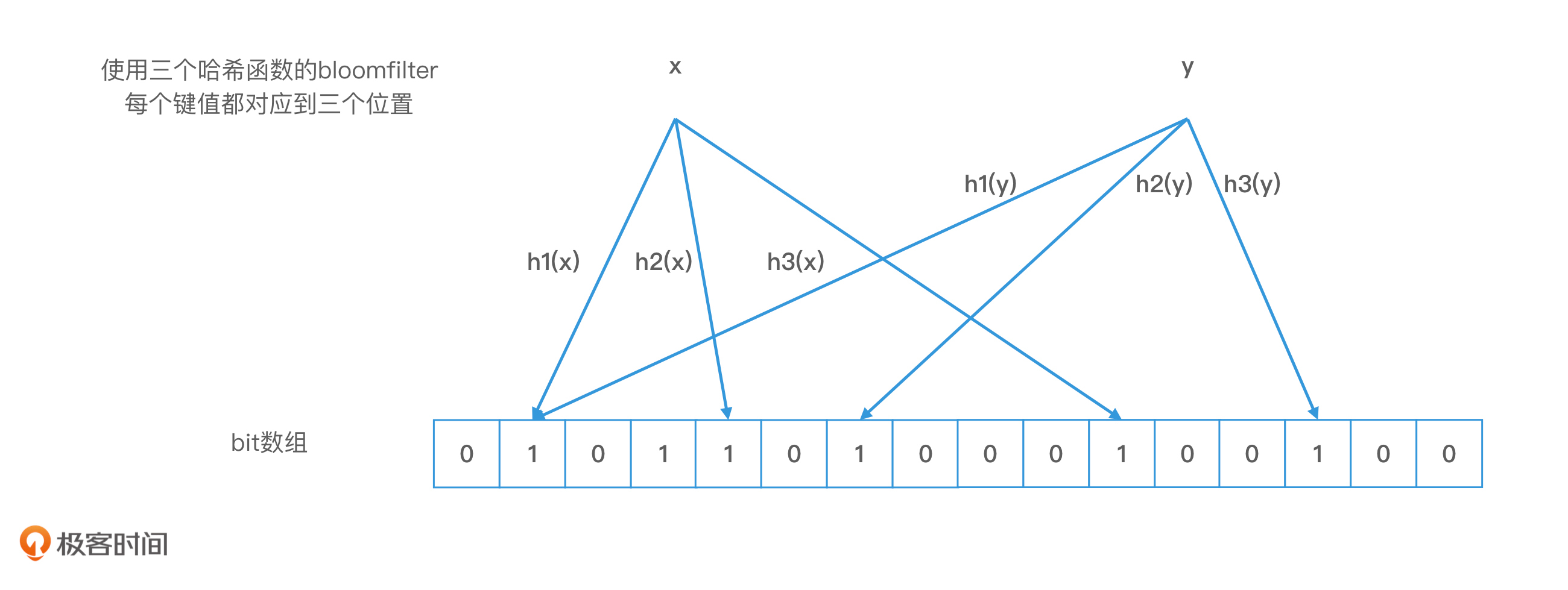 我在下图给出了一个例子。我们可以看到,布隆过滤器中存储了x和y两个对象,它们对应的bit位被置为1。当我们查询一个不存在的对象z时,如果z的k个哈希值的对应位置的值正好都是1,z就会被错误地认定为存在。而且,这个时候,z和x,以及z和y,两两之间也并没有发生哈希冲突。