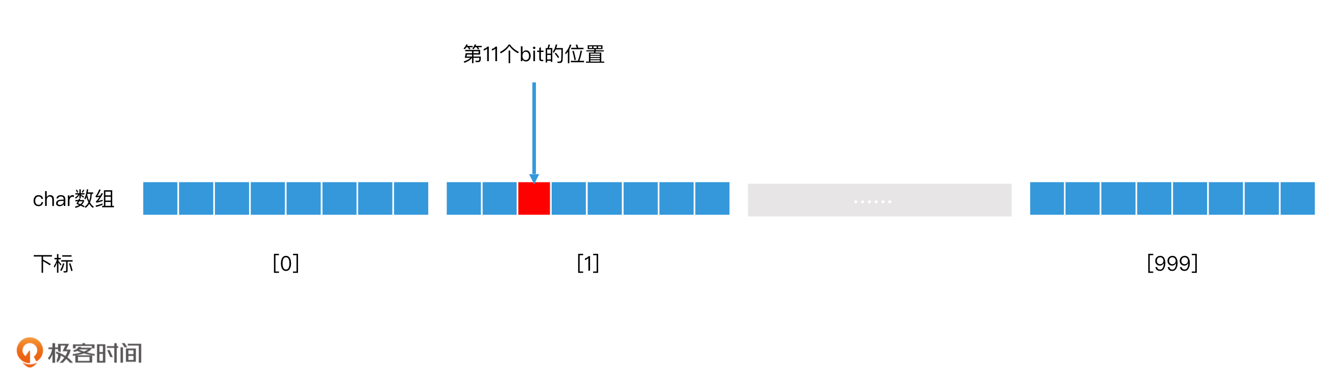 首先,数组是以char类型的元素为一个单位的,因此,我们的第一步,就是要找到第11个bit在数组的第几个元素里。具体的计算过程:一个元素占8个bit,我们用11除以8,得到的结果是1,余数是3。这就代表着,第11个bit存在于第2个元素里,并且在第2个元素里的位置是第3个。